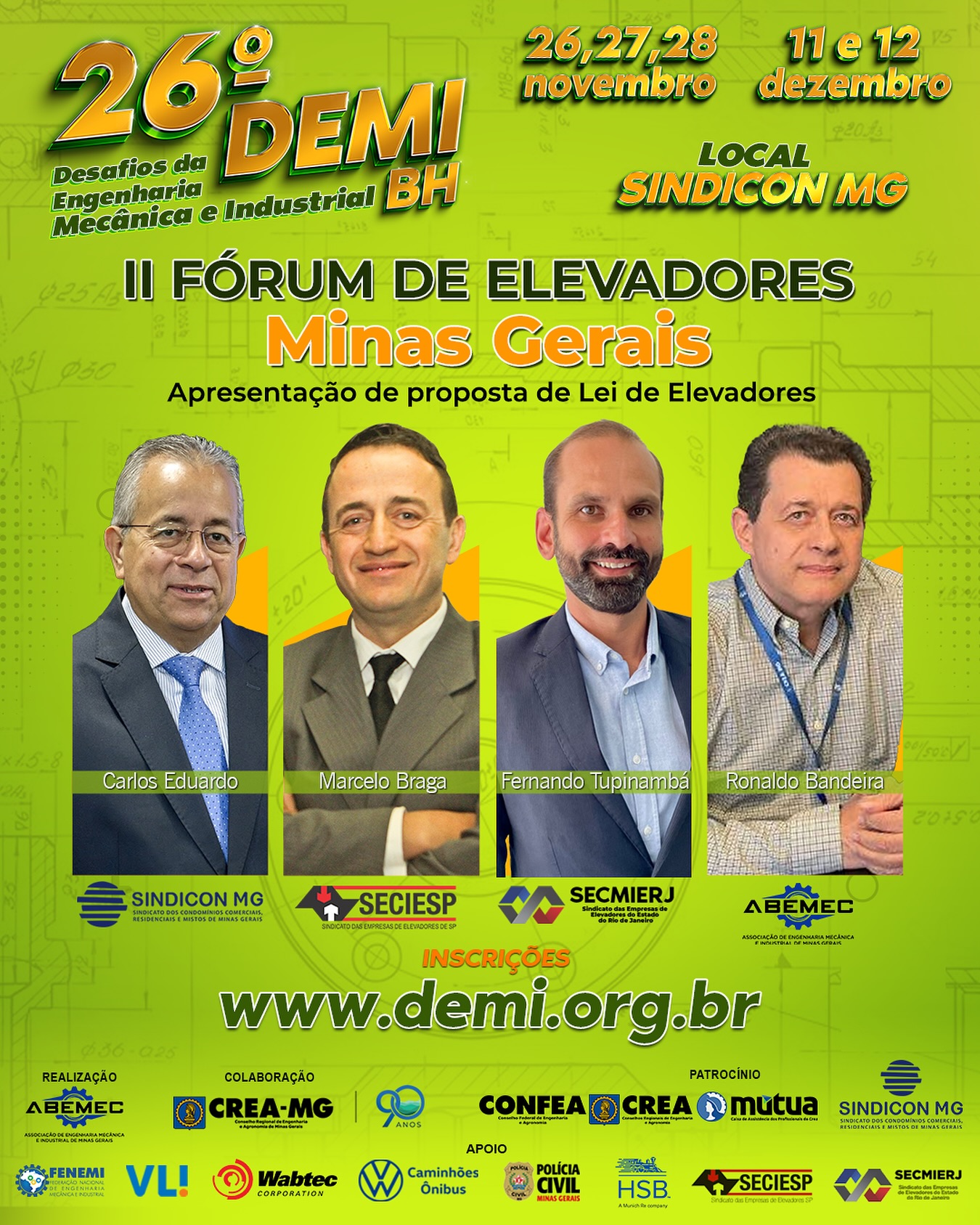 ⚙️ A ABEMEC-MG (Associação Brasileira de Engenheiros Mecânicos e Industriais de MG) em parceria com o SINDICON MG (Sindicato dos Condomínios Comerciais, Residenciais e Mistos de Minas Gerais) tem o prazer de convidá-lo(a), para II Fórum de Elevadores onde apresentaremos sugestões para serem discutidas baseadas em experiência de cidades nacionais e internacionais em função da quantidade excessiva de acidentes que ultimamente vem ocorrendo. Contaremos com a presença de Fernando Tupinambá presidente do SECMIERJ (Sindicato das Empresas de Elevadores do Estado do Rio de Janeiro) e Marcelo Braga presidente do SECIESP (Sindicato das Empresas de Elevadores do Estado de São Paulo), que contribuirão significativamente para o enriquecimento das discussões. O fórum abordará temas de vital importância para o setor, entre os quais se destacam:- Análise estatística de acidentes;- Relatórios a serem apresentados e Periodicidade;- Processos de homologação de empresas e produtos;- Procedimentos para a emissão e envio de Relatórios de Ocorrências;- Modernização de equipamentos;- Implementação de testes periódicos e adesivagem;- Proposta de Legislação.️Detalhes da Reunião:🗓️ Data: 28/11/2024 Horário: 14h às 16hLocal: SINDICON -MGConfirmação de Presença:🌐 Devido à limitação de espaço no local, solicitamos a gentileza de se inscrever através do formulário no link demi.org.br o mais breve possível.🤝 Agradecemos antecipadamente por sua colaboração e esperamos contar com sua valiosa presença.