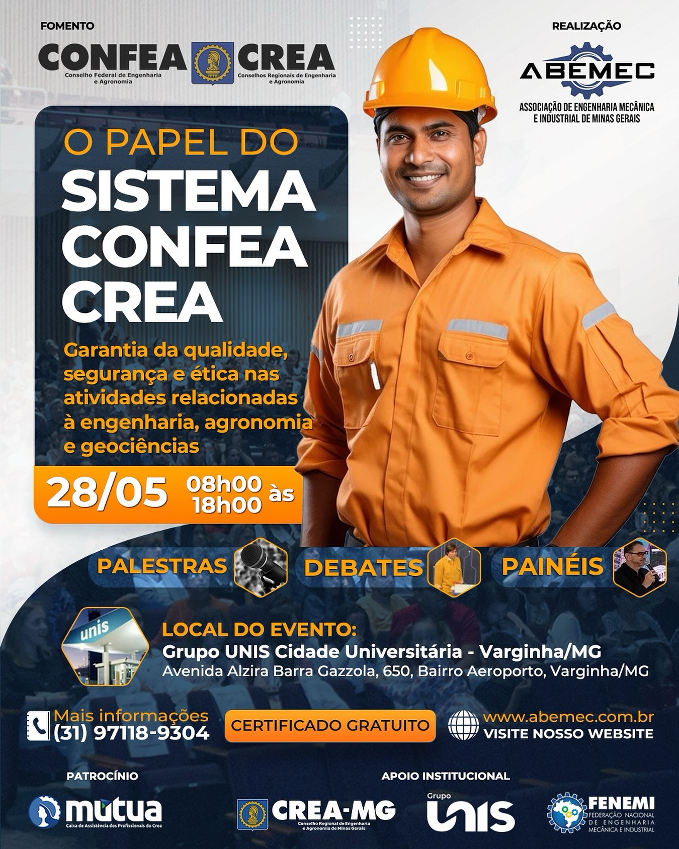 - Próximo 🎙️⚙️A ABEMEC-MG está realizando nas dependências na UNA Aimorés em Belo Horizonte e na Cidade Universitária do Grupo UNIS em Varginha/MG, um evento com palestras, painéis, debates e mesas redondas sobre a importância do Sistema CONFEA/CREA e seu aspecto crucial para garantir a qualidade e segurança em diversas áreas da engenharia e agronomia, fiscalizando a atuação de profissionais e obras, e assegurando que sejam realizados por técnicos habilitados. 🏼♂️♀️O evento visa apresentar e fortalecer o papel do Sistema Confea Crea na proteção da sociedade, promoção do desenvolvimento sustentável e garantia de que os serviços técnicos sejam prestados com ética e profissionalismo.🗓️ 30/04/2025 – UNA Campus Aimorés – Belo Horizonte/MG 19h00🗓️ 28/05/2025 – Grupo UNIS Cidade Universitária – Varginha/MG 08h00 às 18h00