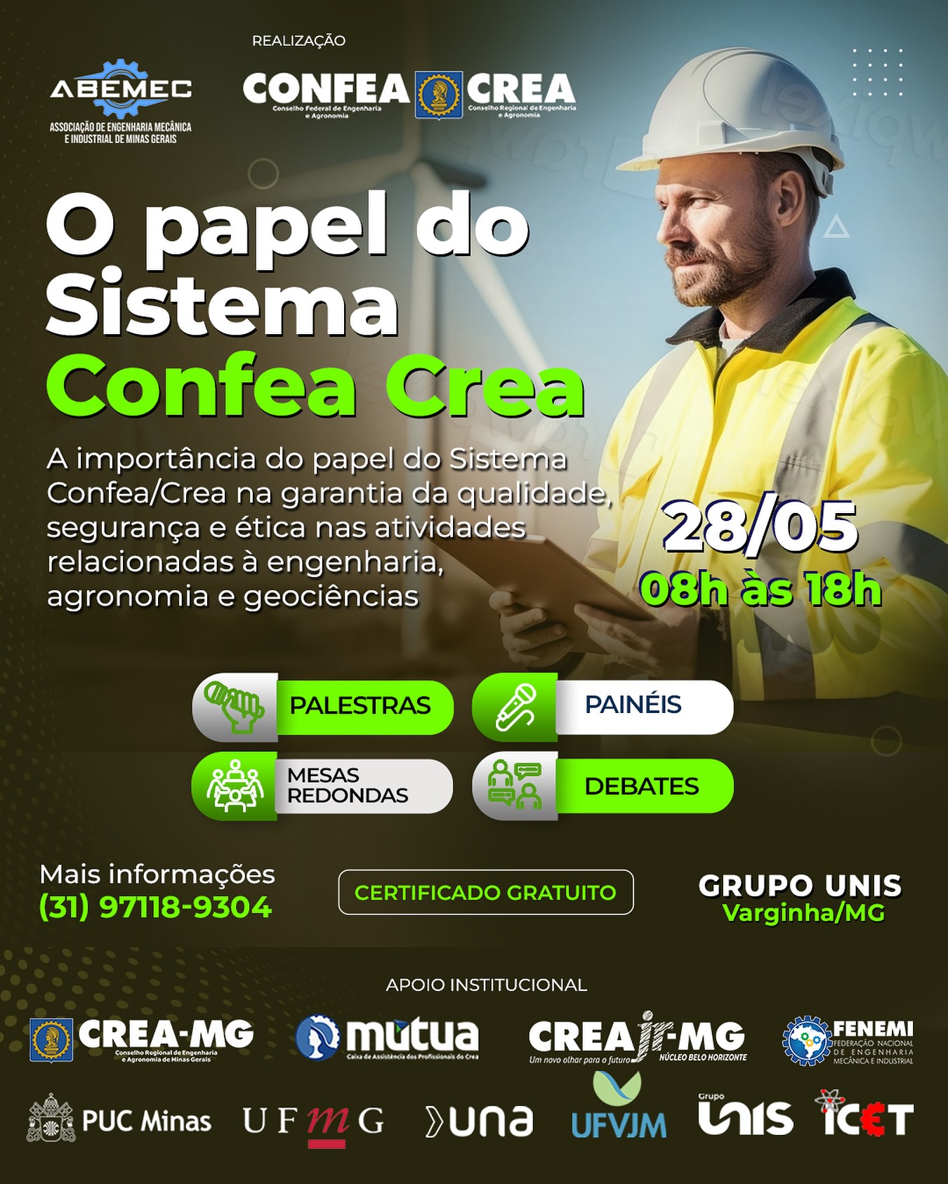 - Próximo ⚙️ A ABEMEC-MG está realizando nas dependências do Grupo UNIS em Varginha/MG um evento imperdível com palestras, painéis, debates e mesas redondas sobre a importância do Sistema CONFEA/CREA e seu aspecto crucial para garantir a qualidade e segurança em diversas áreas da engenharia e agronomia, fiscalizando a atuação de profissionais e obras, e assegurando que sejam realizados por técnicos habilitados.♀️🏼♂️O evento visa apresentar e fortalecer o papel do Sistema Confea Crea na proteção da sociedade, promoção do desenvolvimento sustentável e garantia de que os serviços técnicos sejam prestados com ética e profissionalismo.🗓️ 28/05/2025 08h00 às 18h00