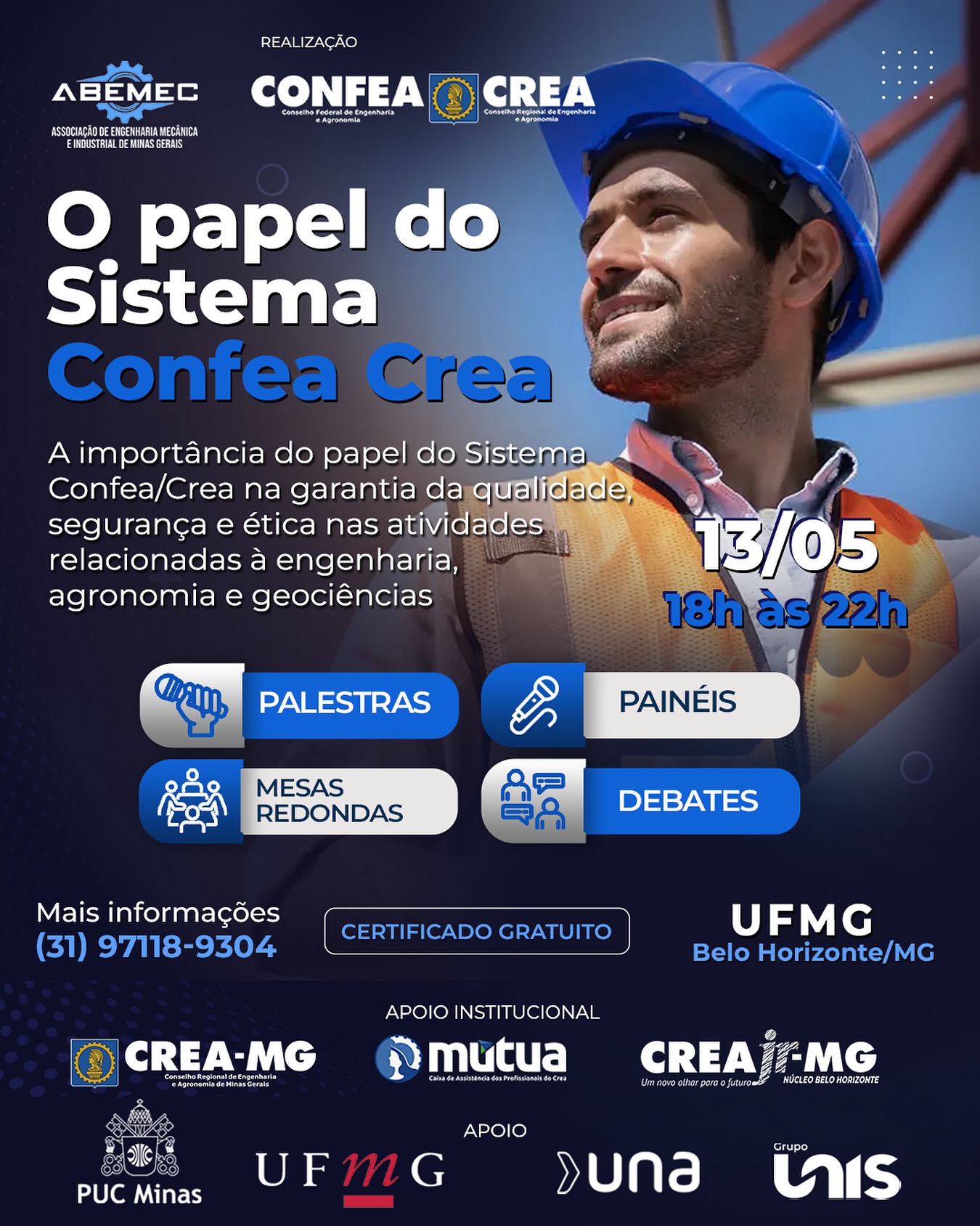🎙️⚙️A ABEMEC-MG está realizando nas dependências na UFMG, na região da Pampulha em Belo Horizonte/MG, um evento com palestras, painéis, debates e mesas redondas sobre a importância do Sistema CONFEA/CREA e seu aspecto crucial para garantir a qualidade e segurança em diversas áreas da engenharia e agronomia, fiscalizando a atuação de profissionais e obras, e assegurando que sejam realizados por técnicos habilitados. 🏼♂️♀️O evento visa apresentar e fortalecer o papel do Sistema Confea Crea na proteção da sociedade, promoção do desenvolvimento sustentável e garantia de que os serviços técnicos sejam prestados com ética e profissionalismo.🗓️ 13/05/2025 – UFMG – Região da Pampulha – Belo Horizonte/MG 18h00 às 22h00#confea#confeacrea#creamg#sistemaconfeacrea#abemec#mutua#mutuamg@confea@creamg@mutua@mutuamg@creajr@ufmg@fenemibr@grupounis@napucminas@unaoficial
