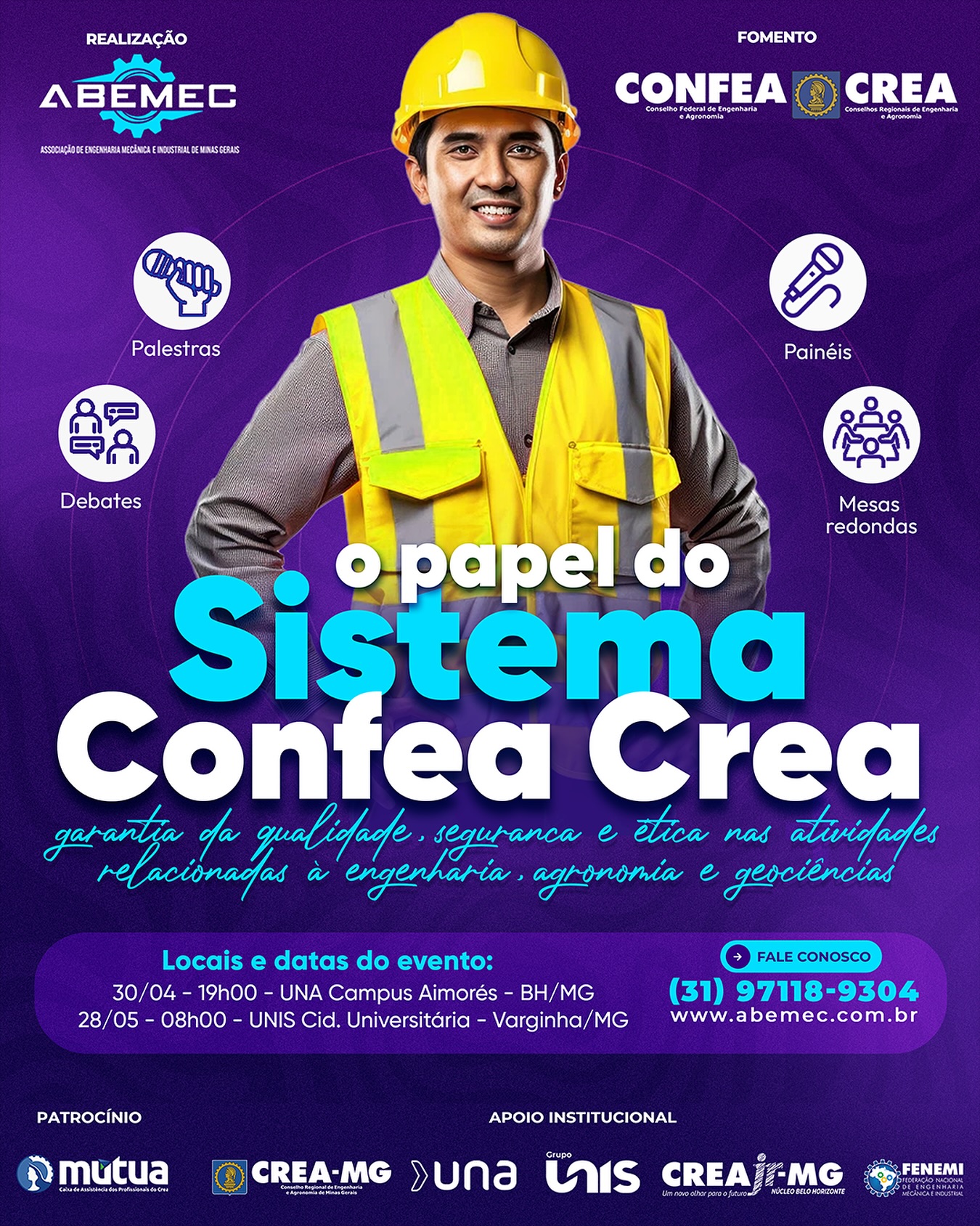 🎙️⚙️A ABEMEC-MG está realizando nas dependências na UNA Aimorés em Belo Horizonte e na Cidade Universitária do Grupo UNIS em Varginha/MG, um evento com palestras, painéis, debates e mesas redondas sobre a importância do Sistema CONFEA/CREA e seu aspecto crucial para garantir a qualidade e segurança em diversas áreas da engenharia e agronomia, fiscalizando a atuação de profissionais e obras, e assegurando que sejam realizados por técnicos habilitados. 🏼♂️♀️O evento visa apresentar e fortalecer o papel do Sistema Confea Crea na proteção da sociedade, promoção do desenvolvimento sustentável e garantia de que os serviços técnicos sejam prestados com ética e profissionalismo.🗓️ 30/04/2025 – UNA Campus Aimorés – Belo Horizonte/MG 19h00🗓️ 28/05/2025 – Grupo UNIS Cidade Universitária – Varginha/MG 08h00 às 18h00
