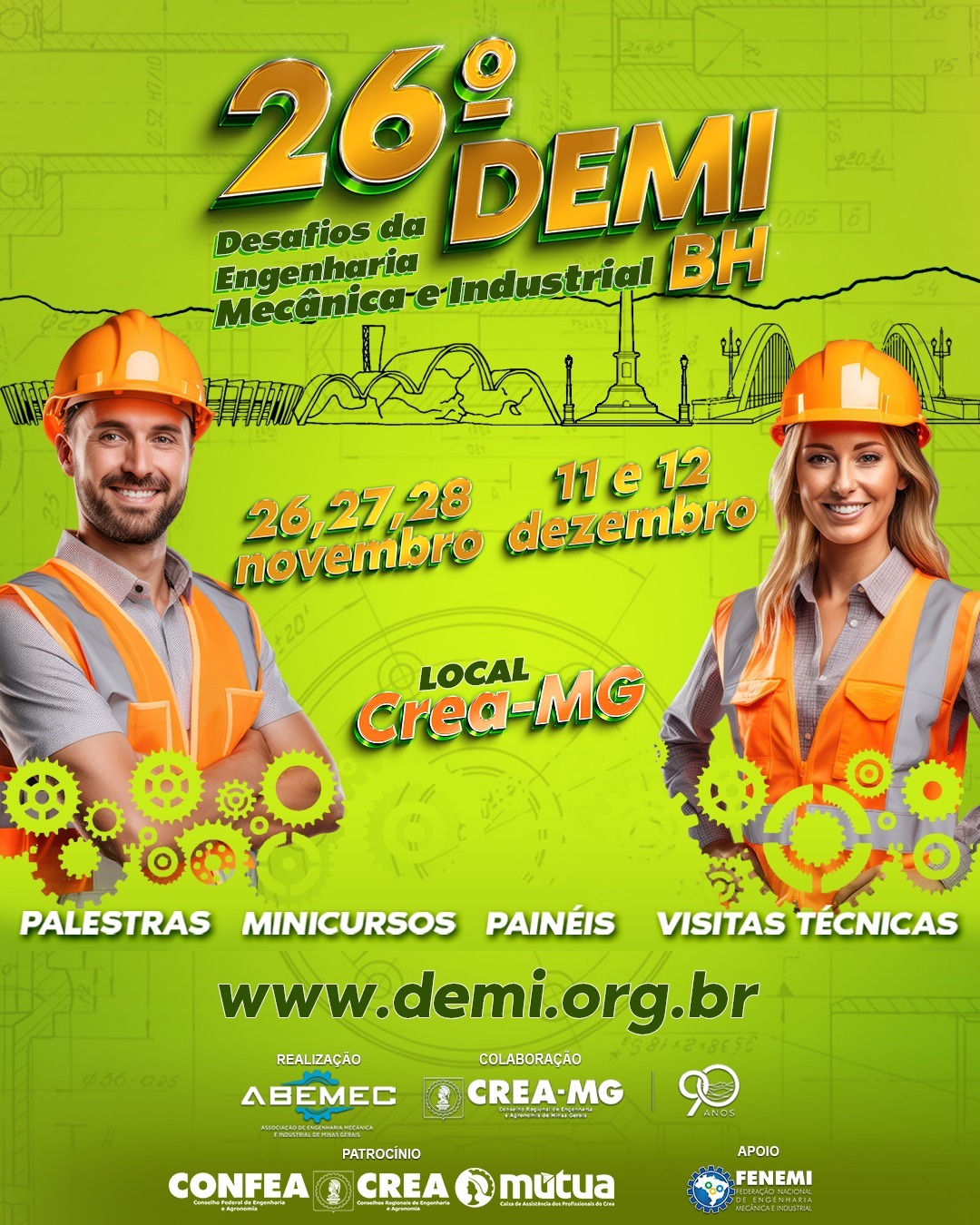 🗓️ EXPANDA TEUS CONHECIMENTOS EM ENGENHARIA! Programe-se e venha para Belo Horizonte! Dias 26, 27 e 28 de novembro e 11 e 12 de dezembro acontecerá o 26° DEMI (Desafios da Engenharia Mecânica e Industrial), que está sendo organizado pela ABEMEC-MG.⚙️ O evento ocorre na cidade de Belo Horizonte, na sede do CREA-MG.️ Nesta edição, abordaremos o tema “A atribuição e valorização dos profissionais da Engenharia Mecânica e Industrial”.🏅Teremos a honra de contar com a presença de profissionais renomados com ampla experiência nas áreas e segmentos de NR13, Elevadores, Automobilístico, Ar Condicionado e Ventilação, Ferroviário e Perícias de Engenharia. Eles compartilharão seus conhecimentos e insights valiosos sobre as melhores práticas e desafios enfrentados nos diversos segmentos da engenharia.🧠 Será uma excelente oportunidade para os estudantes e profissionais da engenharia mecânica e áreas afins discutirem e aprenderem juntos, fortalecendo a comunidade e impulsionando o desenvolvimento da Engenharia na Indústria do Brasil. Não perca essa chance de se atualizar, expandir sua rede de contatos e adquirir conhecimentos relevantes para sua carreira.Muito em breve será aberto as inscrições no evento e divulgado a lista de palestrantes confirmados. Fique ligado nas nossas redes sociais para acompanhar.🏻Contamos com a sua presença e contribuição para tornar esse evento um sucesso!#abemecmg #fenemi #confea #creamg #mutua #mutuamg #evento #demi #belohorizonte #industria #mecanica #industrial #novembro #palestras #engenharia #engenhariamecanica #engenheiro #engenheiros #engenheira