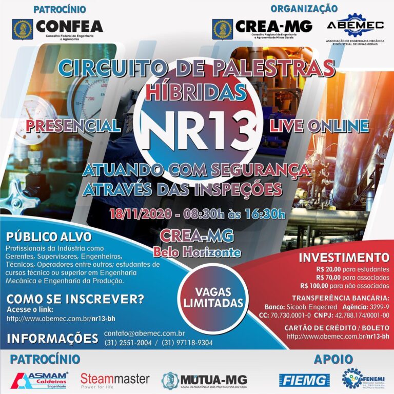 A ABEMEC-MG Associação de Engenharia Mecânica e Industrial de Minas Gerais, com o apoio do CREA-MG, CONFEA, MÚTUA, FIEMG E FENEMI, com o Patrocínio da ASMAM Caldeiras e Steammaster, convidam você a participar da palestra “Atuando com segurança através das inspeções” de NR13.