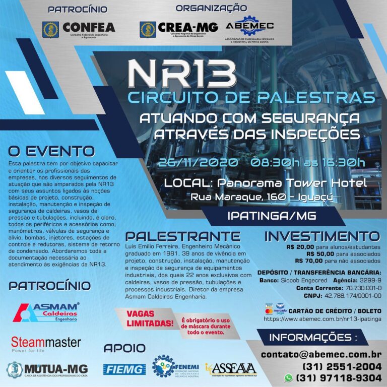 A ABEMEC-MG Associação de Engenharia Mecânica e Industrial de Minas Gerais, com o apoio do CREA-MG, MÚTUA, FIEMG E FENEMI, com o Patrocínio do CONFEA, ASMAM Caldeiras e Steammaster, convidam você a participar da palestra “Atuando com segurança através das inspeções” de NR13 em Belo Horizonte.CLIQUE AQUI E FAÇA SUA INSCRIÇÃO!! http://www.abemec.com.br/nr13-bh/pagamento.html