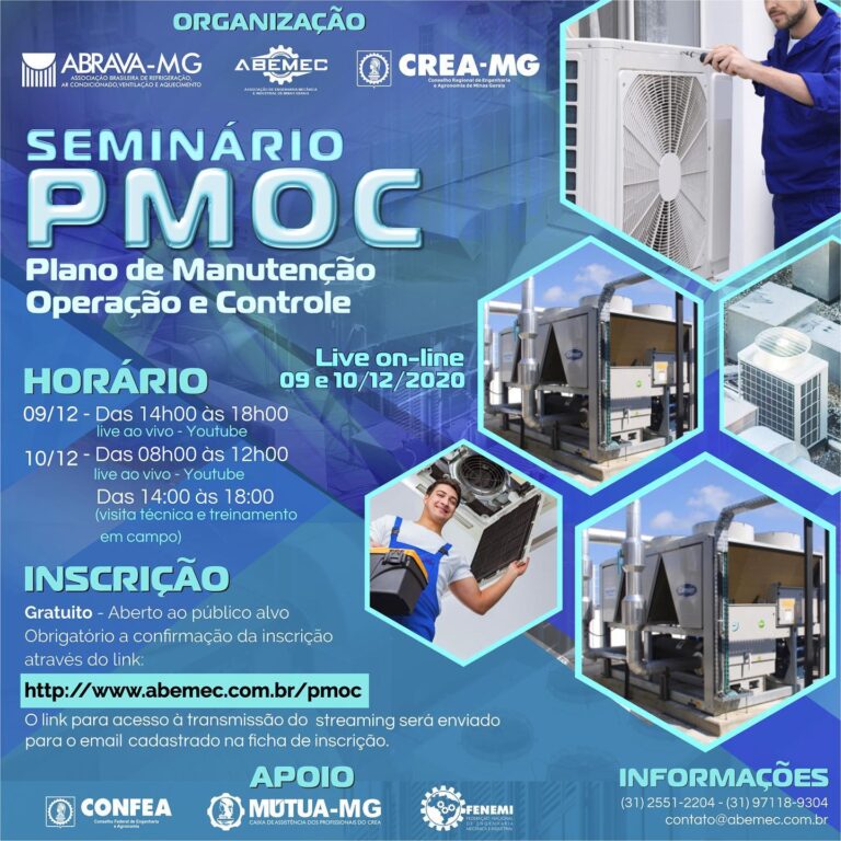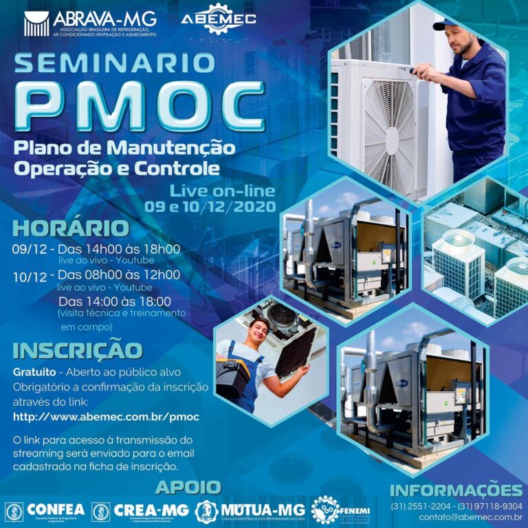 A ABRAVA juntamente com a ABEMEC-MG vem através deste seminário treinar e orientar os fiscais da vigilância sanitária e do Crea-MG para lidarem com o PMOC (Plano de Manutenção, Operação e Controle) e o novo portal da Vigilância Sanitária da Prefeitura Municipal de Belo Horizonte, no qual gestores e proprietários de edificação de uso público, que possuam sistemas de AVAC (Aquecimento, Ventilação e Ar condicionado), deverão lançar as informações relativas aos PMOC dos mesmos, onde a qualidade do ar no interior das edificações e a saúde dos usuários seja atingido.PÚBLICO ALVOFiscais da Vigilância Sanitária, empresários, engenheiros e técnicos do setor de climatização e refrigeração; empreendedores e proprietários de redes de prestação de serviço (hospitais, hotéis, supermercados, lojas, restaurantes, shoppings centers, etc); associações e entidades empresariais que compõem o setor de climatização e refrigeração.