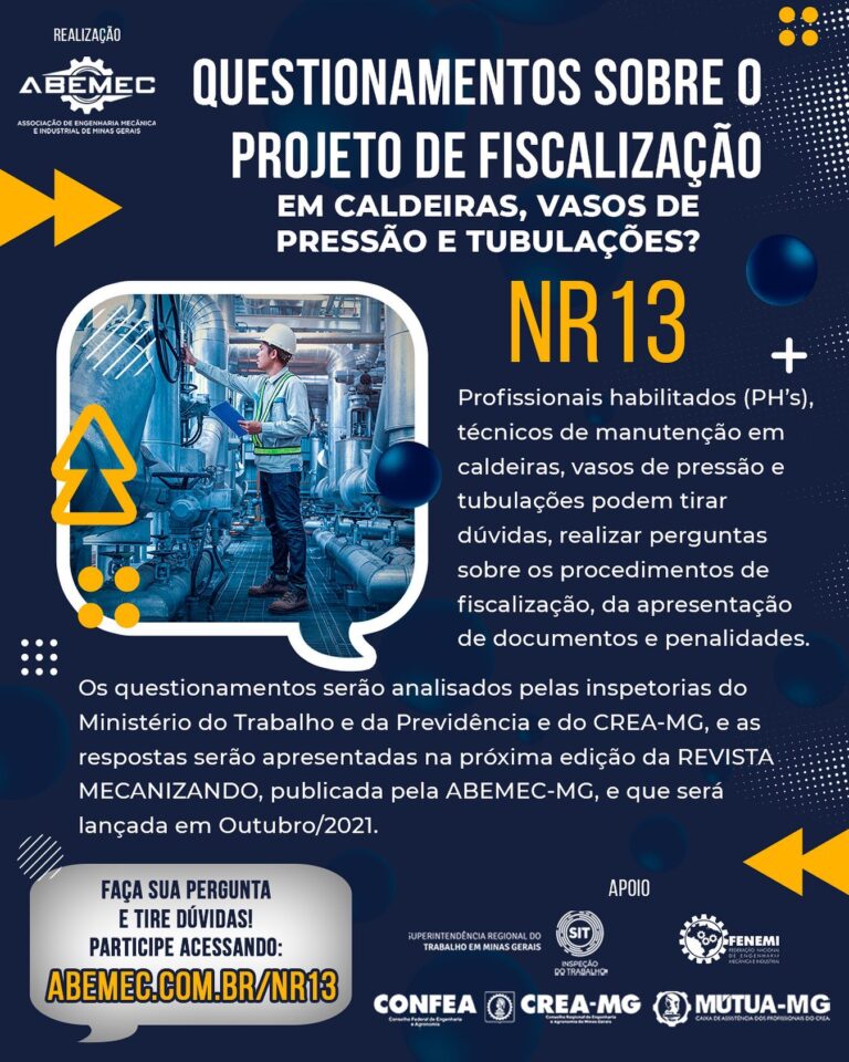 PH ou Responsável Técnico, faça sua pergunta para a Inspetoria do Ministério do Trabalho e da Previdência ou para a Inspetoria do CREA-MG; para isso acesse: ABEMEC.COM.BR/NR13