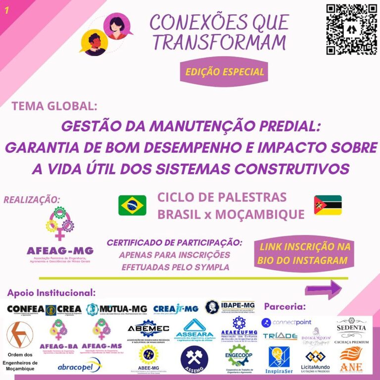 CONEXÕES QUE TRANSFORMAM – Edição Especial.Nessa edição especial faremos um Ciclo de Palestras dividido em 3(três) painéis, sendo o painel 1(um) realizado de forma híbrida, para participar presencialmente o(a) participante deverá solicitar uma vaga após efetuar sua inscrição pelo Sympla. Esta solicitação deverá ser encaminhada por email até o dia 22 de setembro de 2021 – sujeito a confirmação pois o número de vagas é limitado em atendimento aos protocolos sanitários do Covid 19.O Tema Global desta edição especial é GESTÃO DA MANUTENÇÃO PREDIAL: GARANTIA DE BOM DESEMPENHO E IMPACTO SOBRE A VIDA ÚTIL DOS SISTEMAS CONSTRUTIVOS. Serão realizadas apresentações e uma roda de debates entre profissionais do Brasil e de Moçambique trazendo a realidade de cada País referente a questão da manutenção predial, seja ela pública ou privada. A intenção desse evento é proporcional uma troca de experiências e ao final da edição preparar um projeto propondo soluções de melhorias na gestão da manutenção para os dois Países.No Painel 1 serão apresentadas As Edificações e suas Interfaces, uma introdução sobre o tema global que será o pilar para o debate a ser realizado nos paineis 2(dois) e 3(três) que serão realizados nos dias 09/10/2021 e 16/10/2021 respectivamente.Apresentação das Painelistas -Brasil -1. Suenne Barros – Eng Civil e de Segurança do Trabalho.2. Priscila Bolcchi – Eng Ambiental e de Segurança do Trabalho.Moçambique -1. Angela Chade – Eng EletrotécnicaData: 24/set/2021Horário: Brasília: 15h30 – Moçambique: 20h30Ingresso: Evento gratuitoLocal: Evento híbridoPresencial – Sede do Crea-MG – solicitar vaga pelo email após inscrição realizada no SymplaVirtual – Videoconferência – YouTube🖥️ Link inscrição: https://www.sympla.com.br/gestao-da-manutencao-predial—painel-1—as-edificacoes-e-suas-interfaces__1342449 Certificado – Será disponibilizado apenas para quem fizer o check-in pelo Sympla.Realização: Associação Feminina de Engenharia, Agronomia e Geociências de Minas Gerais – AFEAG-MG.Contato: whatsapp – +55 31 99219.2705 – email – afeag.mg@gmail.com – instagram – @afeag.mg