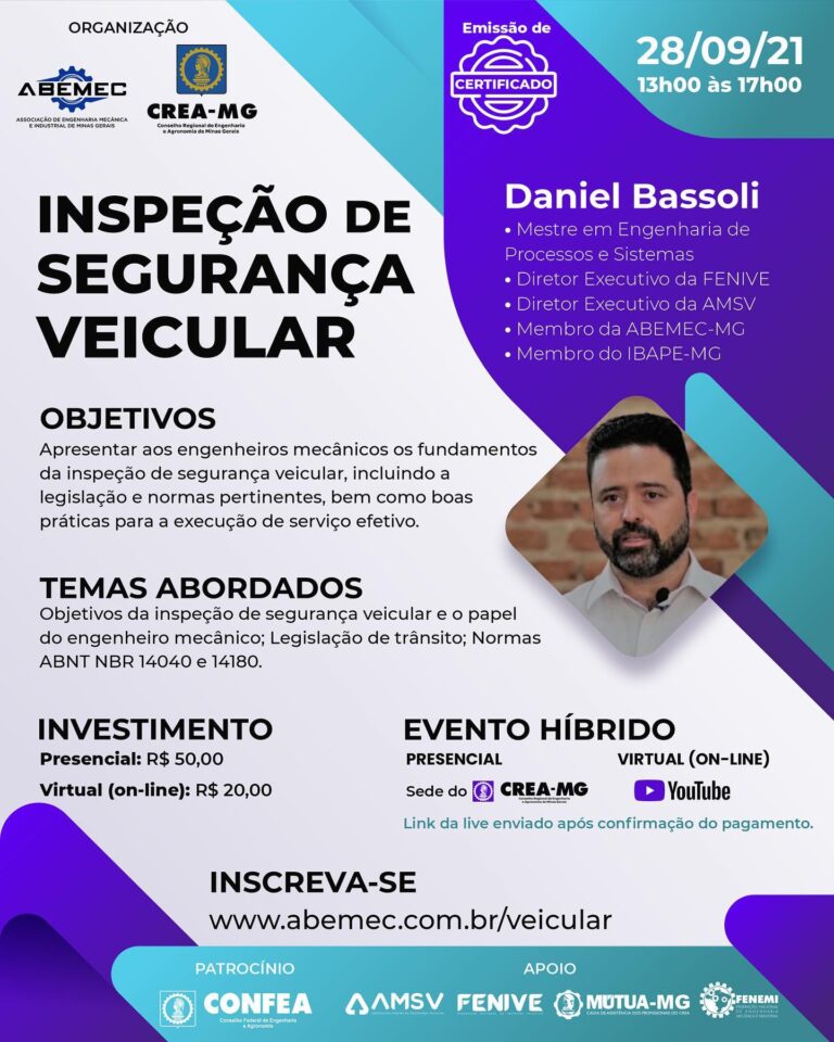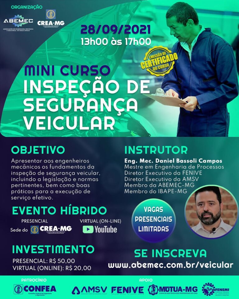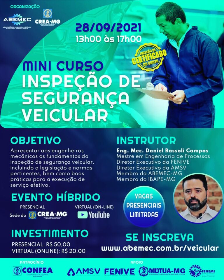 A ABEMEC-MG juntamente com o CREA-MG e patrocínio do CONFEA, convida a todos a participarem do Mini Curso Inspeção de Segurança Veicular a se realizar no dia 28/09/2021 das 13h00 às 17h00 no formato híbrido: Live no YouTube ou presencial na sede do CREA-MG. Se inscreva no link: ABEMEC.COM.BR/VEICULAR #cursosonline #cursonline #confea #treinamento