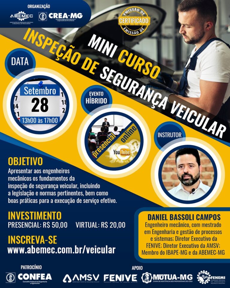Mini Curso de Inspeção de Segurança Veicular, organizado pela ABEMEC-MG. O Mini Curso será no formato HÍBRIDO: presencial e online. Garanta logo a tua vaga! Faça a sua inscrição acessando o site: WWW.ABEMEC.COM.BR/VEICULAR