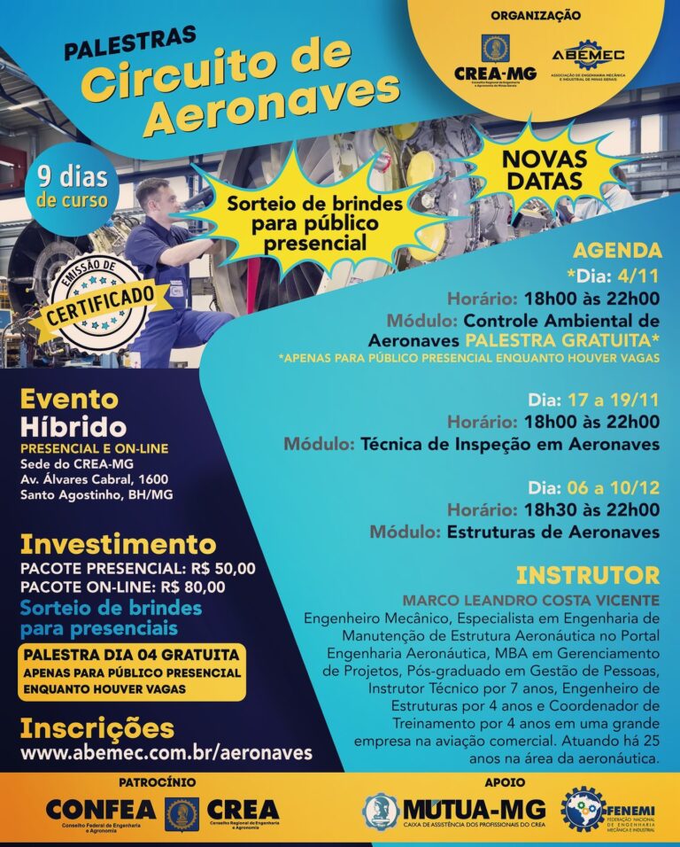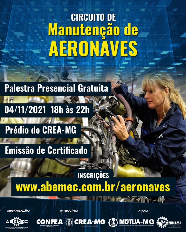 Evento presencial na sede do CREA-MG: Av. Álvares Cabral, 1600, Santo Agostinho, Belo Horizonte/MG. Faça logo a sua inscrição: WWW.ABEMEC.COM.BR/AERONAVES
