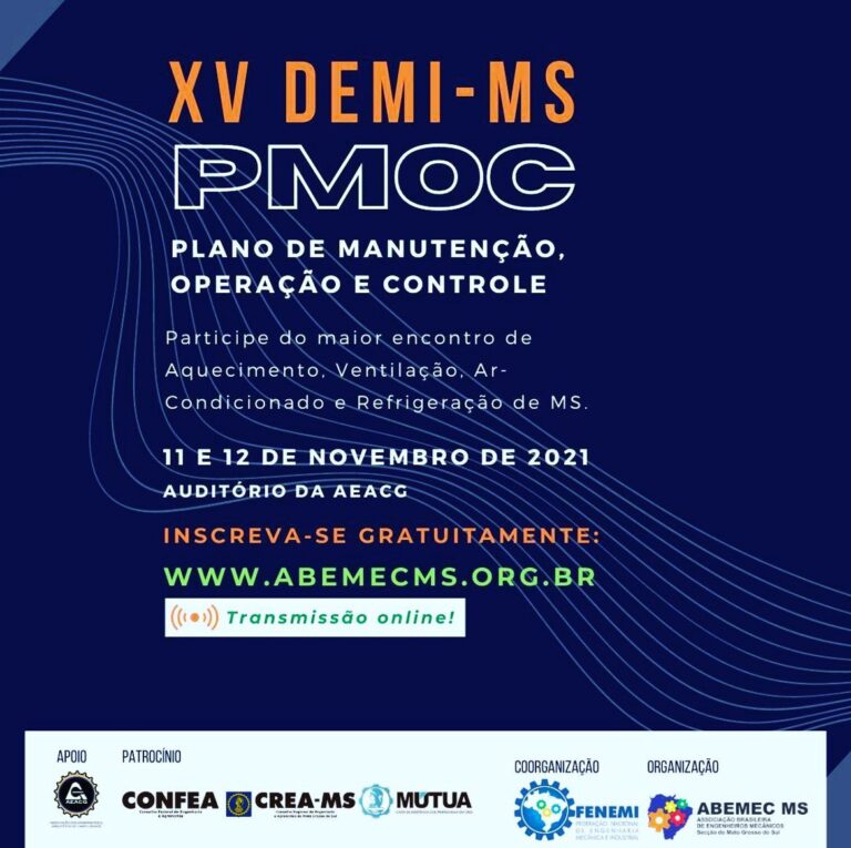 XV DEMI: PMOC – Plano de Manutenção, Operação e Controle nos dias 11 e 12/11/2021. Evento virtual on-line gratuito. Faça sua inscrição! Acesse:WWW.ABEMECMS.ORG.BR