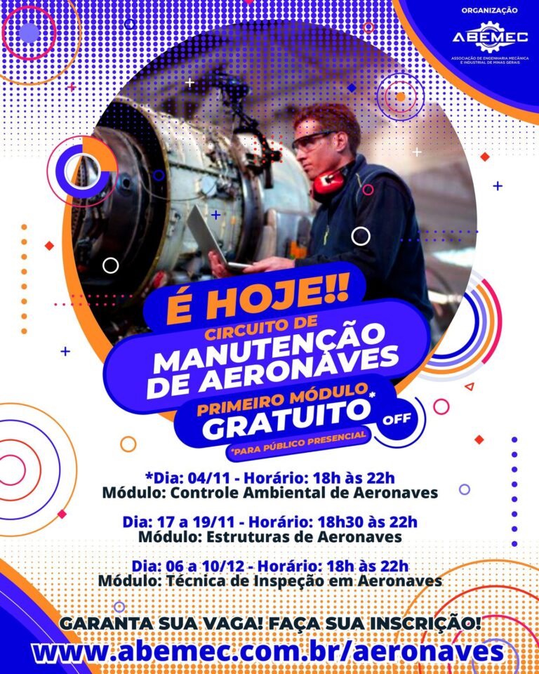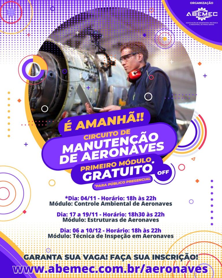 É amanhã! Curso Híbrido de Manutenção de Aeronaves com preço popular! O primeiro módulo é gratuito para público presencial! Faça logo a sua inscrição: WWW.ABEMEC.COM.BR/AERONAVES