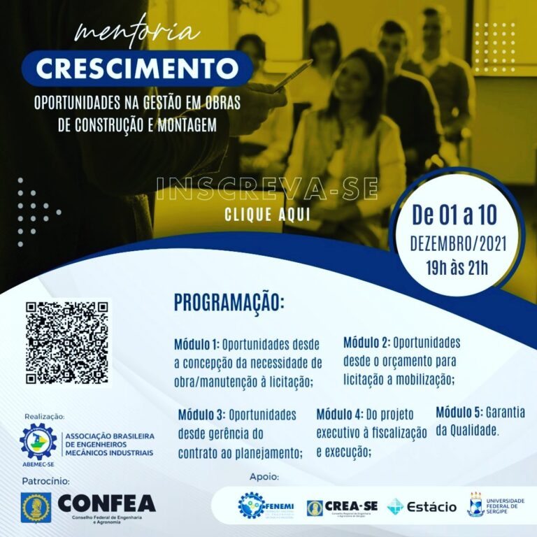 Mentoria: Oportunidades na Gestão de Obras de Construção e Montagem realizado pela ABEMEC-SE. Evento 100% on-line! Treinamentos com preços acessíveis. Faça logo a sua inscrição! Acesse o Sympla da ABEMEC-SE: https://www.sympla.com.br/mentoria—-oportunidades-na-gestao-em-obras-de-construcao-e-montagem__1379776
