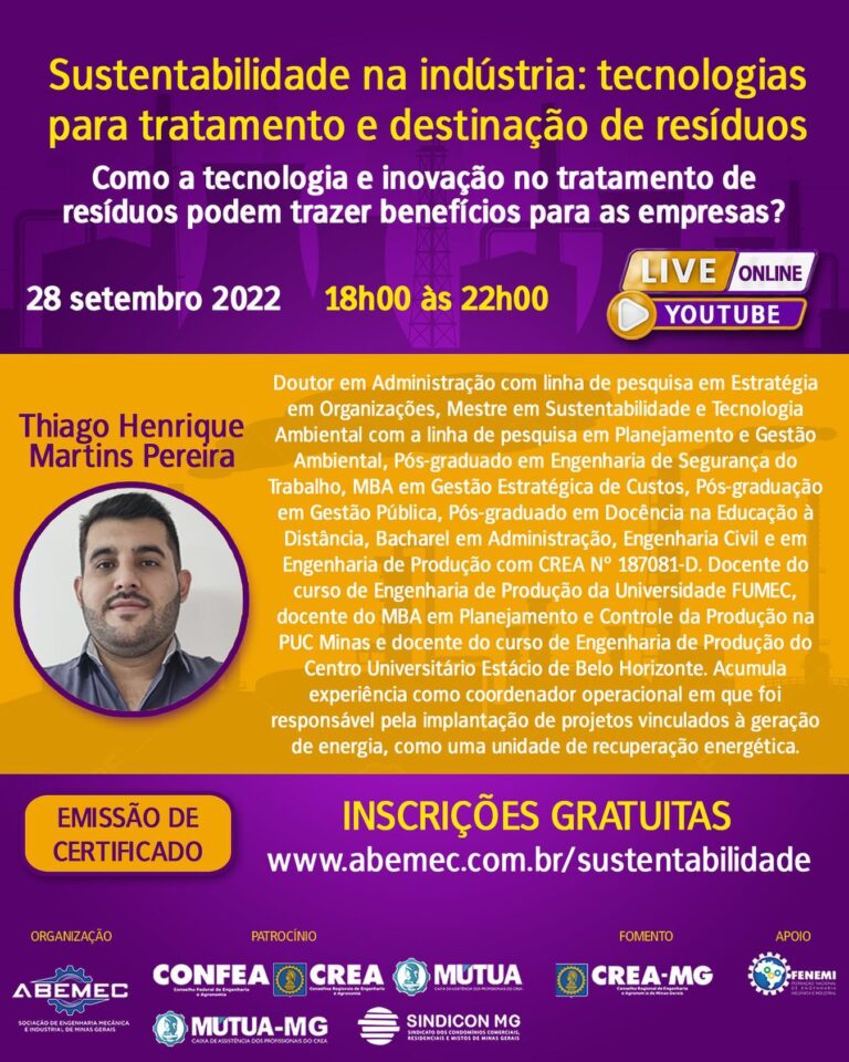 PALESTRA GRATUITA COM CERTIFICADO! Sustentabilidade na Indústria. FAÇA SUA INSCRIÇÃO! www.abemec.com.br/sustentabilidade #abemecmg
