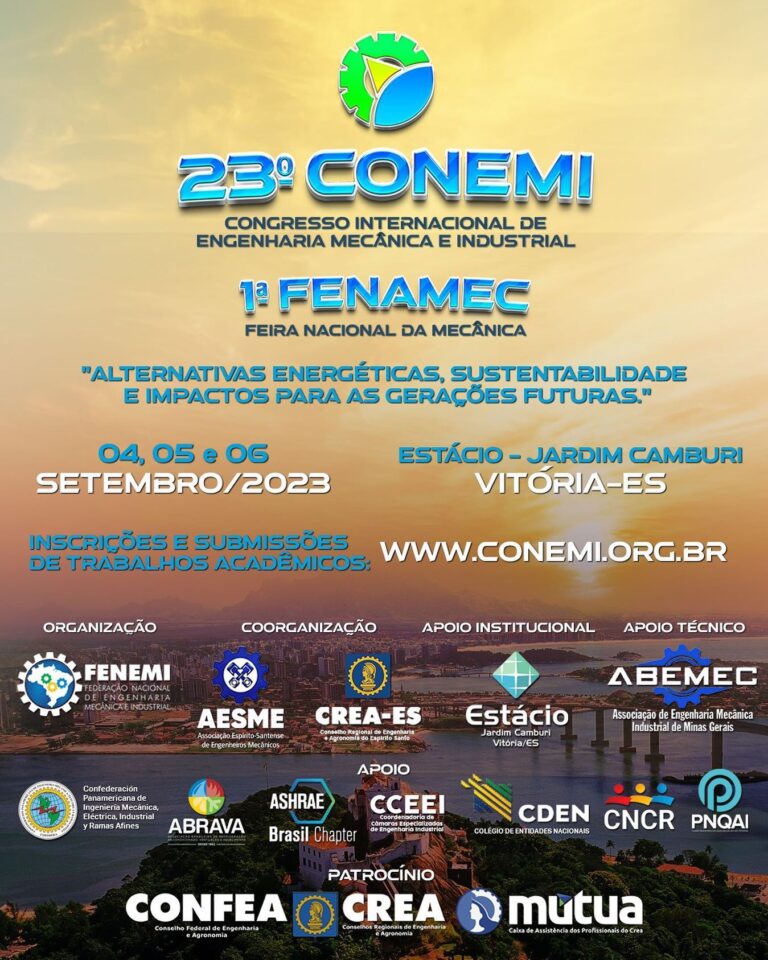 O 230 CONEMI Congresso Internacional deEngenharia Mecânica e Industrial já está com as inscrições e submissões de trabalhos liberadas! O CONEMI é o maior congresso de engenharia mecânica da América Latina e nesta edição está com o tema:"Alternativas energéticas, sustentabilidade e impactos para as gerações futuras". O congresso é realizado anualmente pela FENEMI e este ano conta com a AESME e o CREA-ES como coorganizadores. Este anoserá realizada dentro o congresso o lançamento da 1aFENAMEC Feira Nacional da Mecânica com diversos expositores do setor industrial. Aproveite os preços promocionais do 1o lote e faça logo a sua inscrição e submissão de trabalho. ACESSE: conemi.org.br#fenemi #confea #creaes #conemi #aesme #abemecmg