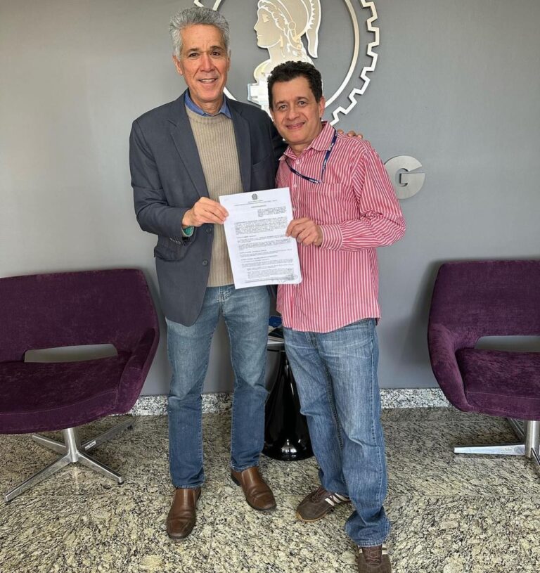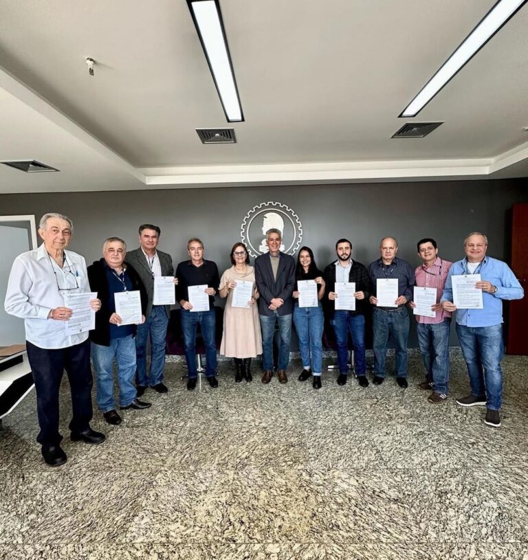 O presidente do Crea-MG Eng. Lucio Borges com o vice-presidente da Abemec-MG o Eng. Mec. Ronaldo Bandeira assinando com outras 10 entidades de classes registradas no Crea-MG termos de colaboração referentes aos cursos de ensino a distância (EAD). Ao todo, 29 entidades tiveram seus projetos aprovados no Chamamento Público EAD 2023. A previsão é de serem ministradas inicialmente 184 horas de cursos.