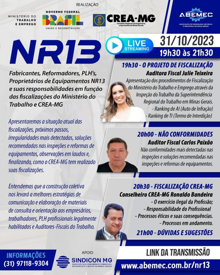 É HOJE! Programe-se! Live sobre NR13 com a ABEMEC-MG, CREA-MG e Ministério do Trabalho! A partir das 19:30. ACESSE: abemec.com.br/nr13
