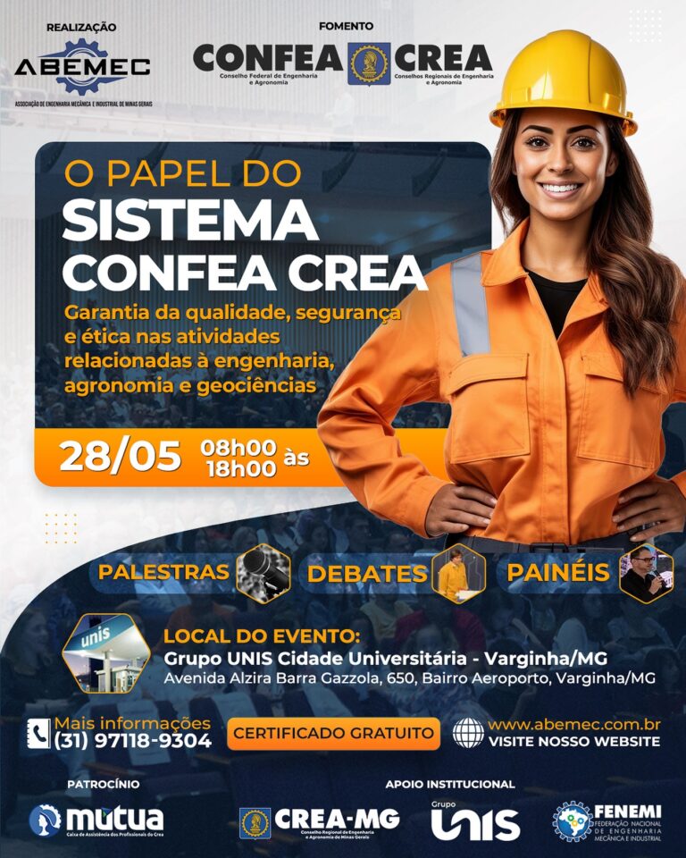 🎙️⚙️A ABEMEC-MG está realizando nas dependências do Grupo UNIS Cidade Universitária em Varginha/MG um evento imperdível com palestras, painéis, debates e mesas redondas sobre a importância do Sistema CONFEA/CREA e seu aspecto crucial para garantir a qualidade e segurança em diversas áreas da engenharia e agronomia, fiscalizando a atuação de profissionais e obras, e assegurando que sejam realizados por técnicos habilitados. 🏼♂️♀️O evento visa apresentar e fortalecer o papel do Sistema Confea Crea na proteção da sociedade, promoção do desenvolvimento sustentável e garantia de que os serviços técnicos sejam prestados com ética e profissionalismo.🗓️ 28/05/2025 08h00 às 18h00