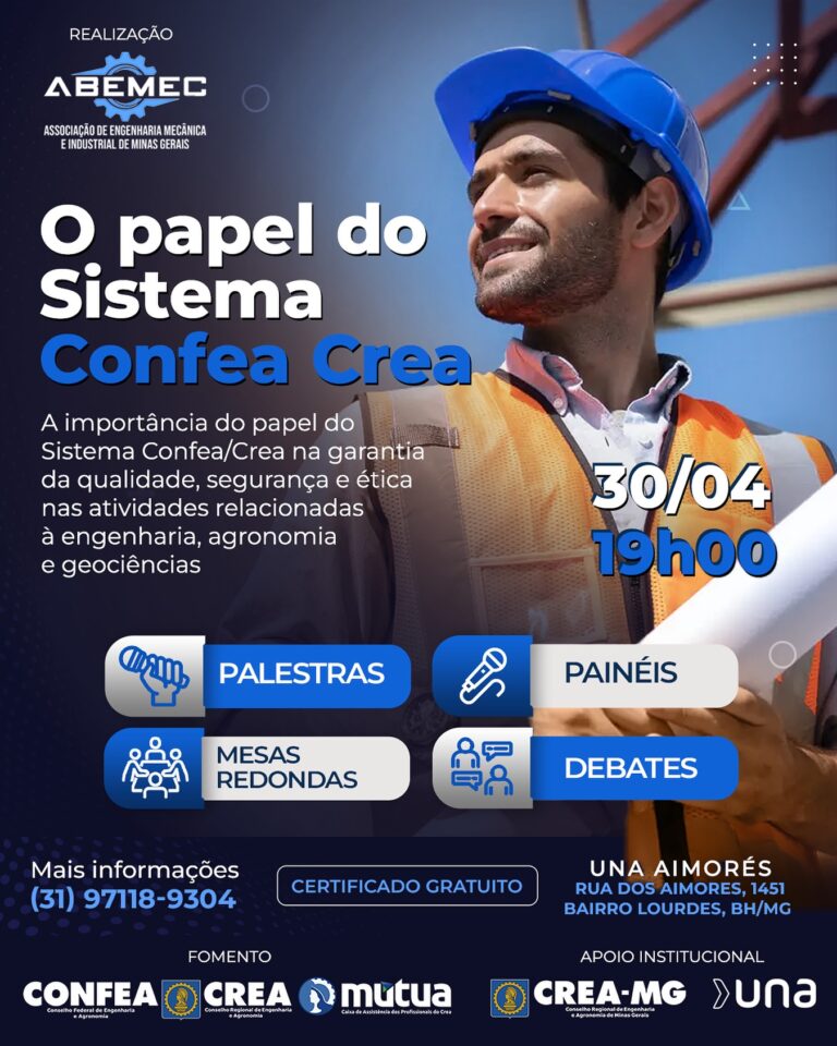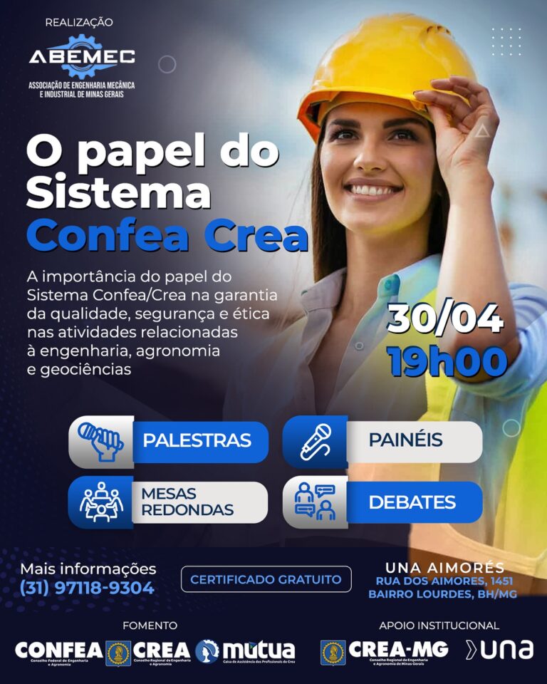 🎙️⚙️A ABEMEC-MG está realizando nas dependências na UNA Aimorés um evento com palestras, painéis, debates e mesas redondas sobre a importância do Sistema CONFEA/CREA e seu aspecto crucial para garantir a qualidade e segurança em diversas áreas da engenharia e agronomia, fiscalizando a atuação de profissionais e obras, e assegurando que sejam realizados por técnicos habilitados. 🏼♂️♀️O evento visa apresentar e fortalecer o papel do Sistema Confea Crea na proteção da sociedade, promoção do desenvolvimento sustentável e garantia de que os serviços técnicos sejam prestados com ética e profissionalismo.🗓️ 30/04/2025 19h00