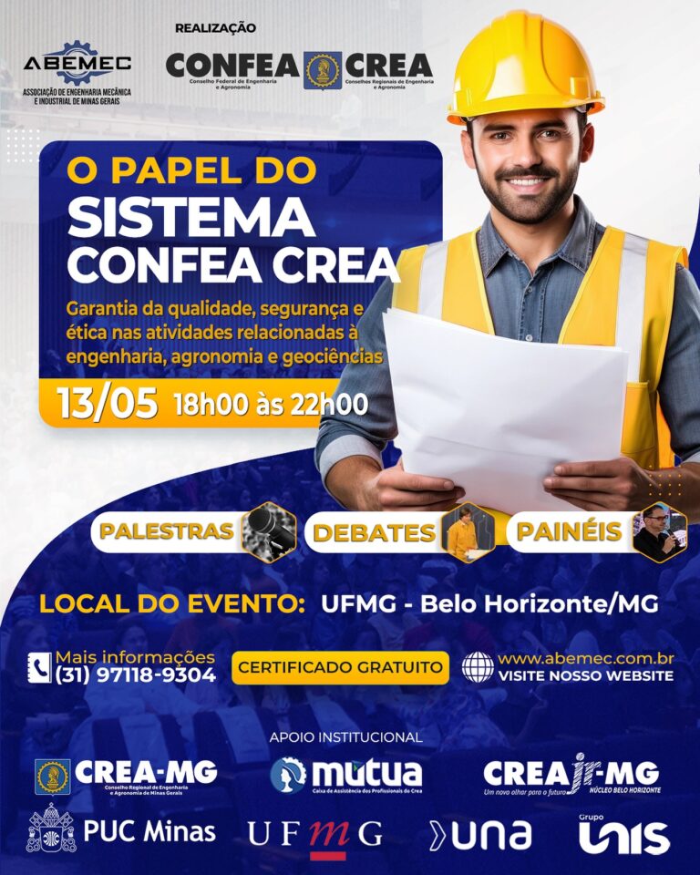 ⚙️ A ABEMEC-MG está realizando nas dependências da UFMG em Belo Horizonte/MG um evento imperdível com palestras, painéis, debates e mesas redondas sobre a importância do Sistema CONFEA/CREA e seu aspecto crucial para garantir a qualidade e segurança em diversas áreas da engenharia e agronomia, fiscalizando a atuação de profissionais e obras, e assegurando que sejam realizados por técnicos habilitados.♀️🏼♂️O evento visa apresentar e fortalecer o papel do Sistema Confea Crea na proteção da sociedade, promoção do desenvolvimento sustentável e garantia de que os serviços técnicos sejam prestados com ética e profissionalismo.🗓️ 13/05/2025 18h00 às 22h00