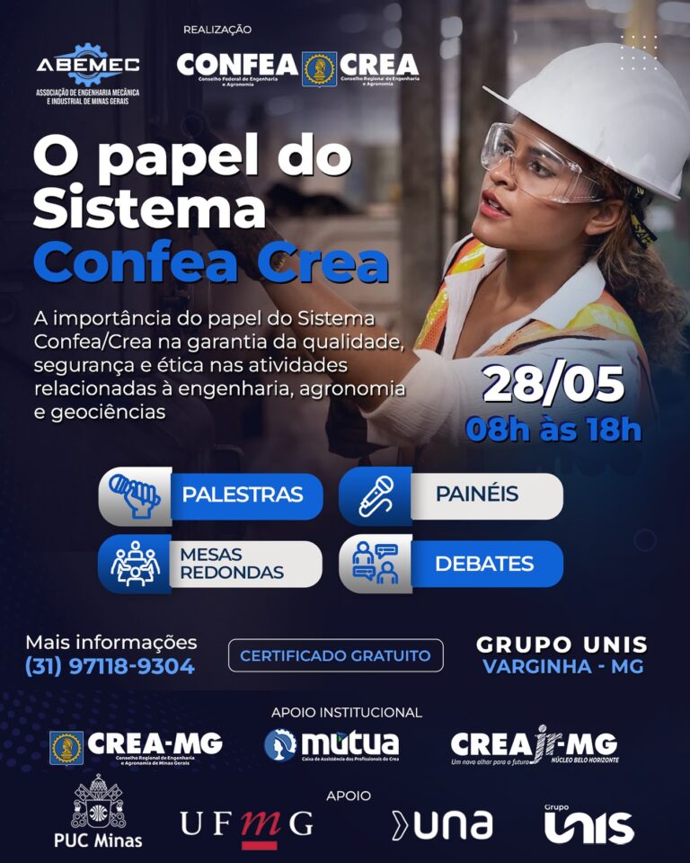 ⚙️ A ABEMEC-MG está realizando nas dependências do Grupo UNIS em Varginha/MG um evento imperdível com palestras, painéis, debates e mesas redondas sobre a importância do Sistema CONFEA/CREA e seu aspecto crucial para garantir a qualidade e segurança em diversas áreas da engenharia e agronomia, fiscalizando a atuação de profissionais e obras, e assegurando que sejam realizados por técnicos habilitados.♀️🏼♂️O evento visa apresentar e fortalecer o papel do Sistema Confea Crea na proteção da sociedade, promoção do desenvolvimento sustentável e garantia de que os serviços técnicos sejam prestados com ética e profissionalismo.🗓️ 28/05/2025 08h00 às 18h00