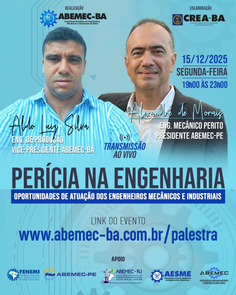 PALESTRA ON-LINE IMPERDÍVEL – ABEMEC-BA & CREA-BA Transmitida ao vivo para todo o BrasilO cenário da Engenharia está em constante evolução, e compreender as novas demandas técnicas, legais e profissionais tornou-se uma vantagem competitiva indispensável. Por isso, a ABEMEC-BA, com a colaboração do CREA-BA, preparou uma palestra exclusiva voltada especialmente para quem busca atualização, visão de mercado e desenvolvimento profissional.Esta é uma oportunidade imperdível, principalmente para jovens engenheiros que desejam fortalecer sua formação, ampliar repertório técnico e se aproximar de referências da engenharia nacional. Tema que está em alta na EngenhariaA palestra aborda um assunto extremamente atual, discutido entre especialistas e cada vez mais valorizado em consultorias, perícias, projetos e inspeções. Uma imersão essencial para quem acompanha as tendências contemporâneas do setor. Palestrante: Alexandre de Moraes Engenheiro Mecânico Perito reconhecido nacionalmente Presidente da ABEMEC-PECom vasta experiência técnica e atuação destacada no país, Alexandre oferece uma visão clara, aprofundada e aplicada — exatamente o tipo de conhecimento que impulsiona carreiras. ⚙️🎛 Moderação: Aldo Luiz Silva Engenheiro de Produção Vice-presidente da ABEMEC-BAResponsável por conduzir a discussão e elevar ainda mais a troca de ideias, Aldo agregará dinamismo e profundidade ao encontro. Data e Horário🗓 15 de dezembro de 2025 Das 19h00 às 20h30 Inscreva-se gratuitamenteVagas limitadas: www.abemec-ba.com.br/palestra Se você deseja acelerar sua trajetória profissional, conectar-se a especialistas e absorver conhecimento prático que faz diferença no mercado, esta palestra é para você.Não deixe para depois. Atualize-se, destaque-se e caminhe um passo à frente na Engenharia.