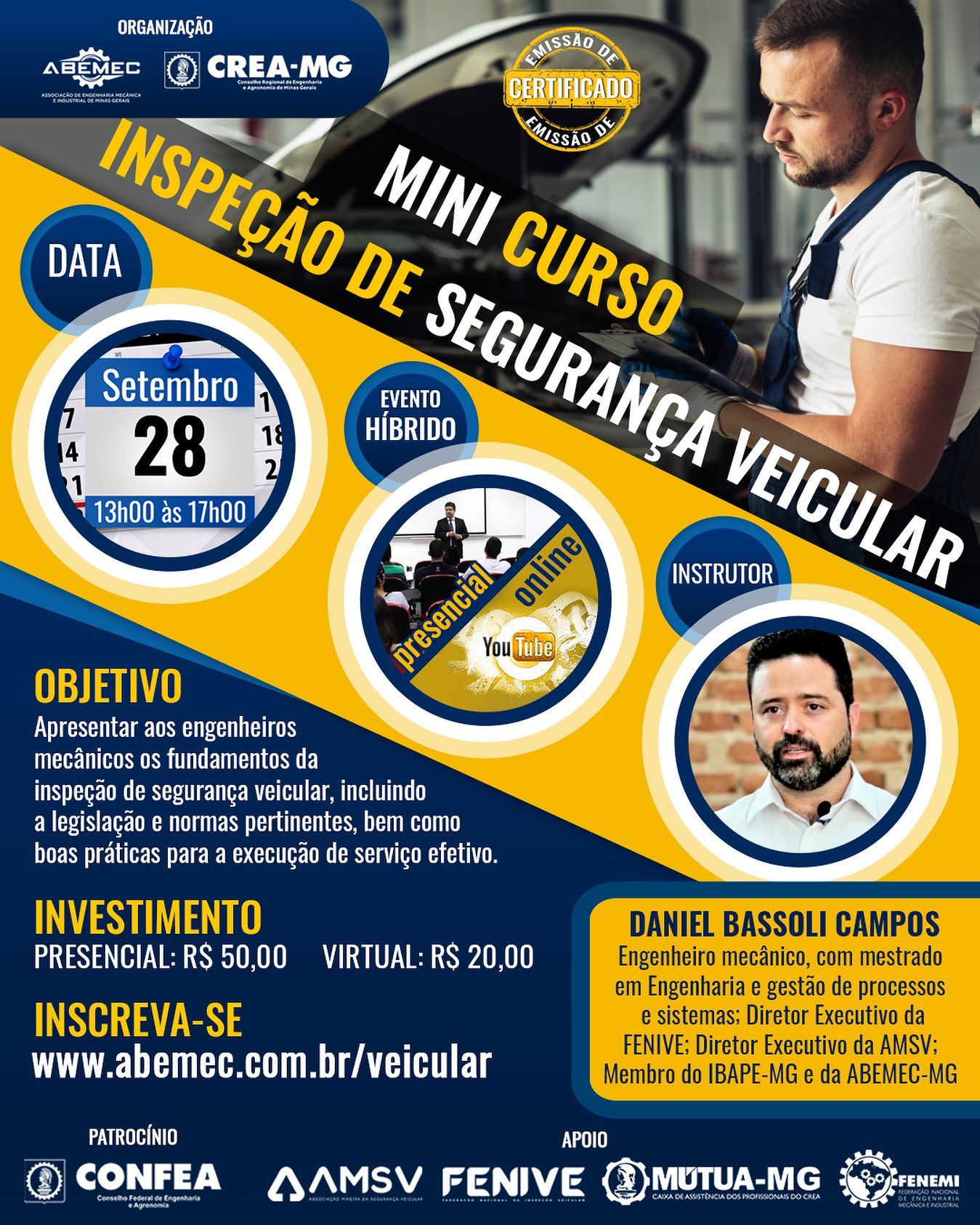 A ABEMEC-MG juntamente com o CREA-MG e patrocínio do CONFEA, convida a todos a participarem do Mini Curso Inspeção de Segurança Veicular a se realizar no dia 28/09/2021 das 13h00 às 17h00 no formato híbrido: Live no YouTube ou presencial na sede do CREA-MG. Se inscreva no link: ABEMEC.COM.BR/VEICULAR #cursosonline #cursonline #confea #treinamento