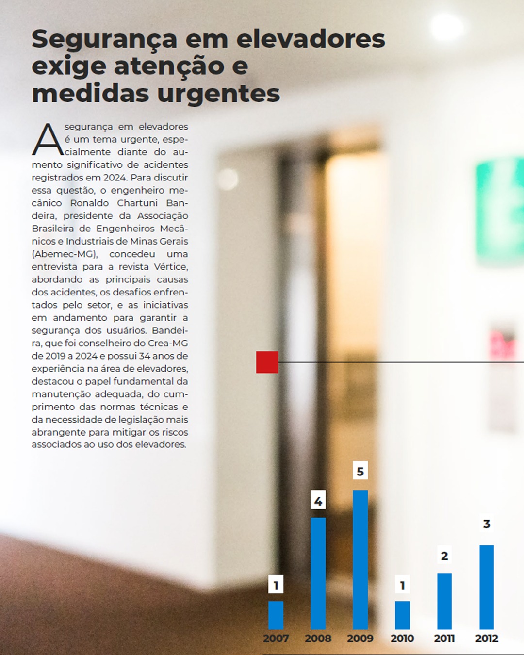 A segurança em elevadores é um tema urgente, especialmente diante do aumento significativo de acidentes registrados em 2024. Para discutiressa questão, o engenheiro mecânico Ronaldo Chartuni Bandeira, presidente da Associação Brasileira de Engenheiros Mecânicos e Industriais de Minas Gerais (Abemec-MG), concedeu uma entrevista para a revista Vértice, abordando as principais causas dos acidentes, os desafios enfrentados pelo setor, e as iniciativas em andamento para garantir a segurança dos usuários.