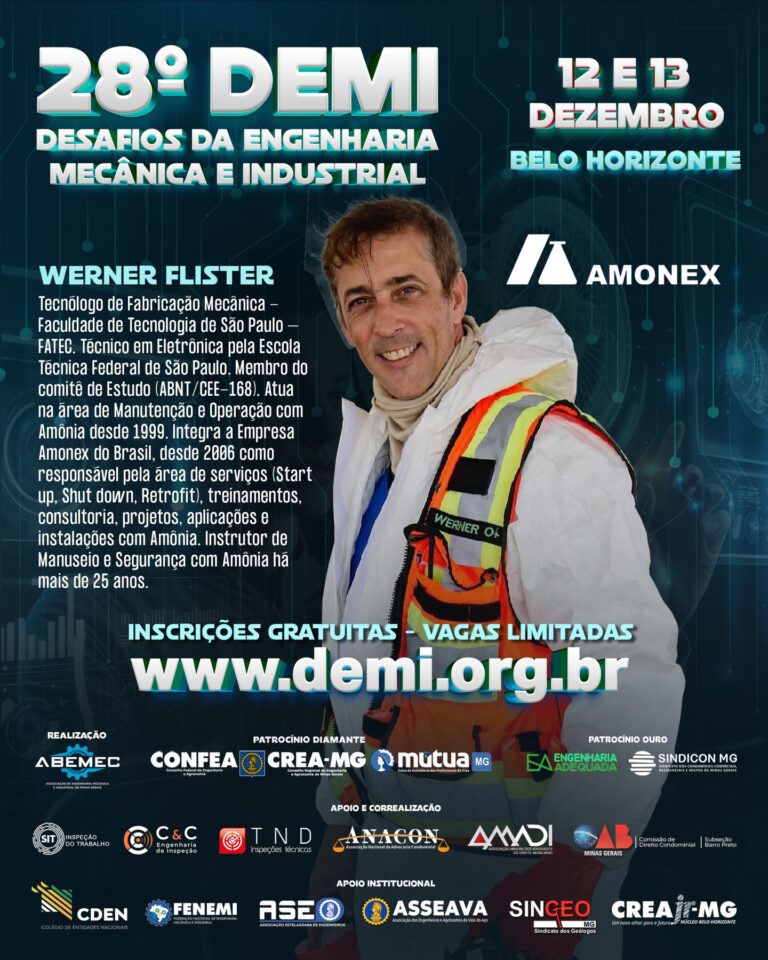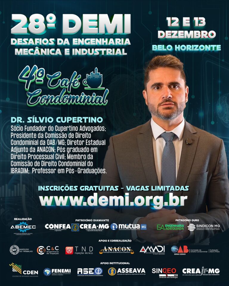Vem aí o 28º DEMI – Desafios da Engenharia Mecânica e Industrial! ⚙️O encontro definitivo para quem respira inovação, tecnologia e o futuro da engenharia!PALESTRANTE: Antonio Geraldo da Silva, Presidente do SINGEO-MG Sindicato dos Geólogos de Minas Gerais. ⚙️Engenheiro Geólogo formado pela tradicional Escola de Minas de Ouro Preto (1973), com especialização em Engenharia Geotécnica pelo INBEC/Universidade de São Paulo (2013–2015). Com mais de 45 anos de experiência, atuou em importantes empresas do setor mineral e geotécnico, como Embraminer, Geosol, Magnesita, Mineração Acaba Mundo, Casa de Pedra, Mineração Morro Velho (Vale) e em projetos geotécnicos da Prefeitura de Belo Horizonte. ⚙️Realizado pela ABEMEC-MG, com o patrocínio do CONFEA, CREA-MG e MÚTUA-MG, o DEMI chega à sua 28ª edição nos dias 12 e 13 de dezembro reunindo profissionais, estudantes e especialistas para dois dias intensos de conhecimento, networking e inspiração. O que você vai encontrar no 28º DEMI?Palestras técnicas de alto impacto com temas atuais da Engenharia Mecânica e Industrial 🧠⚙️Debates sobre inovação, automação e avanços tecnológicos que estão moldando o futuro da profissão 🤖Insights exclusivos com profissionais renomados do setor Um ambiente dinâmico para ampliar sua rede de contatos e oportunidades 🤝 Por que participar?Porque o DEMI é o espaço onde ideias ganham força, projetos encontram caminhos e carreiras se transformam. Um evento feito por engenheiros, para engenheiros — e para todos que querem estar na linha de frente da evolução tecnológica. 🌍 Marque na agenda: 12 e 13 de dezembro Prepare-se para viver uma experiência única na engenharia!🌐 Inscrições poderão ser feitas no: www.demi.org.brNão fique de fora! Sua próxima grande inspiração pode nascer aqui. ⚙️