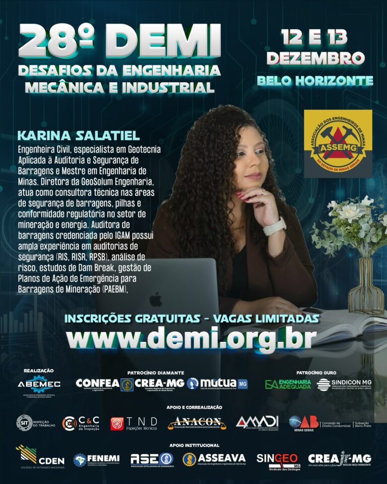 Vem aí o 28º DEMI – Desafios da Engenharia Mecânica e Industrial! ⚙️O encontro definitivo para quem respira inovação, tecnologia e o futuro da engenharia! E teremos Karina Salatiel e muitos outros palestrantes especializados em diversas áreas técnicas e de gestão. Karina é Engenheira Civil, especialista em Geotecnia Aplicada à Auditoria e Segurança de Barragens e Mestre em Engenharia de Minas. Diretora da GeoSolum Engenharia, atua como consultora técnica nas áreas de segurança de barragens, pilhas e conformidade regulatória no setor de mineração e energia.Auditora de barragens credenciada pelo IGAM, possui ampla experiência em auditorias de segurança (RIS, RISR, RPSB), análise de risco, estudos de Dam Break, gestão de Planos de Ação de Emergência para Barragens de Mineração (PAEBM), protocolos e atualizações de ACO, RCO e DCO, além de atuação em resposta a emergências, gerenciamento de crises e continuidade dos negócios.Desenvolve e implementa Planos de Gerenciamento de Riscos de Barragens (PGRBM), aplicando metodologias como HIRA e FMEA. Possui sólida experiência em legislação minerária e ambiental, com domínio das NRMs, Resoluções e Portarias da ANM, da Resolução ANM nº 95/2022 e das regulamentações do IGAM e FEAM. Atua com sistemas de gestão como SIGBM e SIGIBAR, além de monitoramento geotécnico em estruturas de mineração, PCHs e UHEs. Marque na agenda: 12 e 13 de dezembro Prepare-se para viver uma experiência única na engenharia!🌐 Inscrições poderão ser feitas no: www.demi.org.brNão fique de fora! Sua próxima grande inspiração pode nascer aqui. ⚙️
