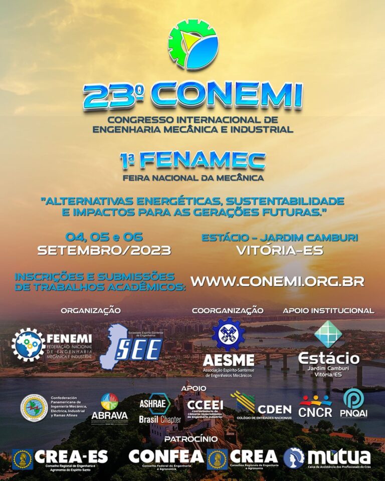 O 23° CONEMI Congresso Internacional de Engenharia Mecânica e Industrial já está com as inscrições e submissões de trabalhos liberadas! O CONEMI é o maior congresso de engenharia mecânica da América Latina e nesta edição está com o tema "Alternativas energéticas, sustentabilidade e impactos para as gerações futuras". O congresso é realizado anualmente pela FENEMI e este ano conta com a organização do SEE Sociedade Espírito-Santense de Engenheiros, com a AESME Associação Espírito-Santense de Engenheiros Mecânicos como coorganizadora e o patrocínio do CREA-ES e do Sistema CONFEA/CREA/MÚTUA. De modo especial contamos com o apoio da ESTÁCIO Jardim Camburi em Vitória, local onde acontecerá o congresso. Este ano será realizada dentro o congresso o lançamento da 1a FENAMEC Feira Nacional da Mecânica com diversos expositores do setor industrial. Aproveite os preços promocionais do 1o lote e faça logo a sua inscrição e submissão de trabalho. ACESSE: even3.com.br/conemi23#fenemi #confea #creaes #conemi #aesme