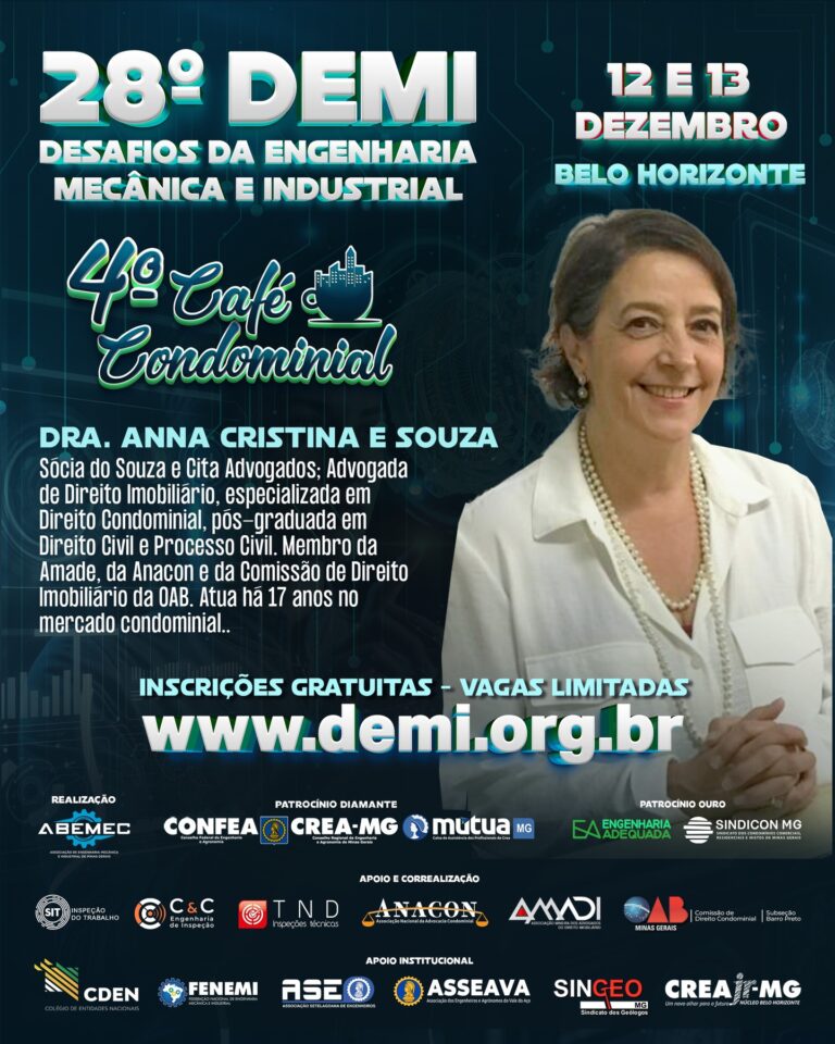 Vem aí o 28º DEMI – Desafios da Engenharia Mecânica e Industrial e o CAFÉ CONDOMINIAL ACONTECE DENTRO DO EVENTO!⚙️O encontro definitivo para quem respira inovação, tecnologia e o futuro da engenharia!PALESTRANTE: Anna Cristina e Souza é Sócia do Souza e Cita Advogados; Advogada de Direito Imobiliário, especializada em Direito Condominial, pós-graduada em Direito Civil e Processo Civil. Membro da Amade, da Anacon e da Comissão de Direito Imobiliário da OAB. Atua há 17 anos no mercado condominial.⚙️Realizado pela ABEMEC-MG, com o patrocínio do CONFEA, CREA-MG e MÚTUA-MG, o DEMI chega à sua 28ª edição nos dias 12 e 13 de dezembro reunindo profissionais, estudantes e especialistas para dois dias intensos de conhecimento, networking e inspiração. O que você vai encontrar no 28º DEMI?Palestras técnicas de alto impacto com temas atuais da Engenharia Mecânica e Industrial 🧠⚙️Debates sobre inovação, automação e avanços tecnológicos que estão moldando o futuro da profissão 🤖Insights exclusivos com profissionais renomados do setor Um ambiente dinâmico para ampliar sua rede de contatos e oportunidades 🤝 Por que participar?Porque o DEMI é o espaço onde ideias ganham força, projetos encontram caminhos e carreiras se transformam. Um evento feito por engenheiros, para engenheiros — e para todos que querem estar na linha de frente da evolução tecnológica. 🌍 Marque na agenda: 12 e 13 de dezembro Prepare-se para viver uma experiência única na engenharia!🌐 Inscrições poderão ser feitas no: www.demi.org.brNão fique de fora! Sua próxima grande inspiração pode nascer aqui. ⚙️