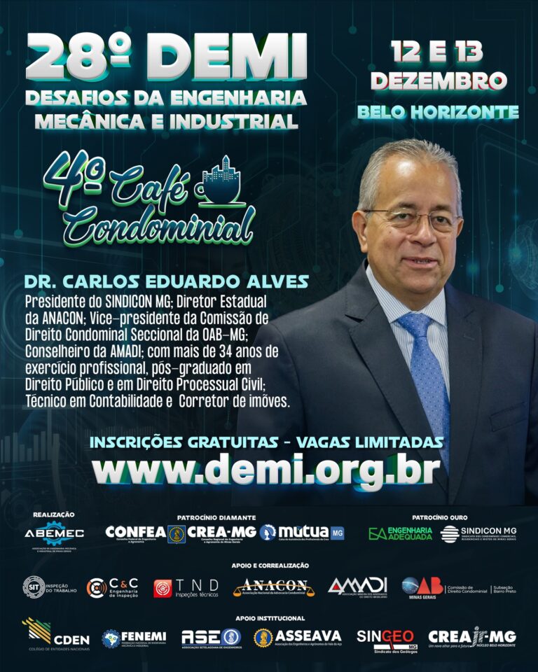 Vem aí o 28º DEMI – Desafios da Engenharia Mecânica e Industrial e o CAFÉ CONDOMINIAL ACONTECE DENTRO DO EVENTO!⚙️O encontro definitivo para quem respira inovação, tecnologia e o futuro da engenharia!PALESTRANTE: Dr. Carlos Eduardo Alves de Queiroz. Presidente do SINDICON MG; Diretor Estadual da ANACON; Vice-presidente da Comissão de Direito Condominial Seccional da OAB-MG; Conselheiro da AMADI; com mais de 34 anos de exercício profissional, pós-graduado em Direito Público e em Direito Processual Civil; Técnico em Contabilidade e Corretor de Imóveis.⚙️Realizado pela ABEMEC-MG, com o patrocínio do CONFEA, CREA-MG e MÚTUA-MG, o DEMI chega à sua 28ª edição nos dias 12 e 13 de dezembro reunindo profissionais, estudantes e especialistas para dois dias intensos de conhecimento, networking e inspiração. O que você vai encontrar no 28º DEMI?Palestras técnicas de alto impacto com temas atuais da Engenharia Mecânica e Industrial 🧠⚙️Debates sobre inovação, automação e avanços tecnológicos que estão moldando o futuro da profissão 🤖Insights exclusivos com profissionais renomados do setor Um ambiente dinâmico para ampliar sua rede de contatos e oportunidades 🤝 Por que participar?Porque o DEMI é o espaço onde ideias ganham força, projetos encontram caminhos e carreiras se transformam. Um evento feito por engenheiros, para engenheiros — e para todos que querem estar na linha de frente da evolução tecnológica. 🌍 Marque na agenda: 12 e 13 de dezembro Prepare-se para viver uma experiência única na engenharia!🌐 Inscrições poderão ser feitas no: www.demi.org.brNão fique de fora! Sua próxima grande inspiração pode nascer aqui. ⚙️
