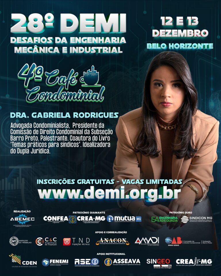 Vem aí o 28º DEMI – Desafios da Engenharia Mecânica e Industrial! ⚙️ E o CAFÉ CONDOMINIAL ACONTECE DENTRO DO EVENTO!O encontro definitivo para quem respira inovação, tecnologia e o futuro da engenharia!PALESTRANTE: Dra. Gabriela Rodrigues, Advogada Condominialista, Presidente da Comissão de Direito Condominial da Subseção Barro Preto. Palestrante. Coautora do Livro "Temas práticos para síndicos". Idealizadora do Dupla Jurídica.⚙️Realizado pela ABEMEC-MG, com o patrocínio do CONFEA, CREA-MG e MÚTUA-MG, o DEMI chega à sua 28ª edição nos dias 12 e 13 de dezembro reunindo profissionais, estudantes e especialistas para dois dias intensos de conhecimento, networking e inspiração. O que você vai encontrar no 28º DEMI?Palestras técnicas de alto impacto com temas atuais da Engenharia Mecânica e Industrial 🧠⚙️Debates sobre inovação, automação e avanços tecnológicos que estão moldando o futuro da profissão 🤖Insights exclusivos com profissionais renomados do setor Um ambiente dinâmico para ampliar sua rede de contatos e oportunidades 🤝 Por que participar?Porque o DEMI é o espaço onde ideias ganham força, projetos encontram caminhos e carreiras se transformam. Um evento feito por engenheiros, para engenheiros — e para todos que querem estar na linha de frente da evolução tecnológica. 🌍 Marque na agenda: 12 e 13 de dezembro Prepare-se para viver uma experiência única na engenharia!🌐 Inscrições poderão ser feitas no: www.demi.org.brNão fique de fora! Sua próxima grande inspiração pode nascer aqui. ⚙️