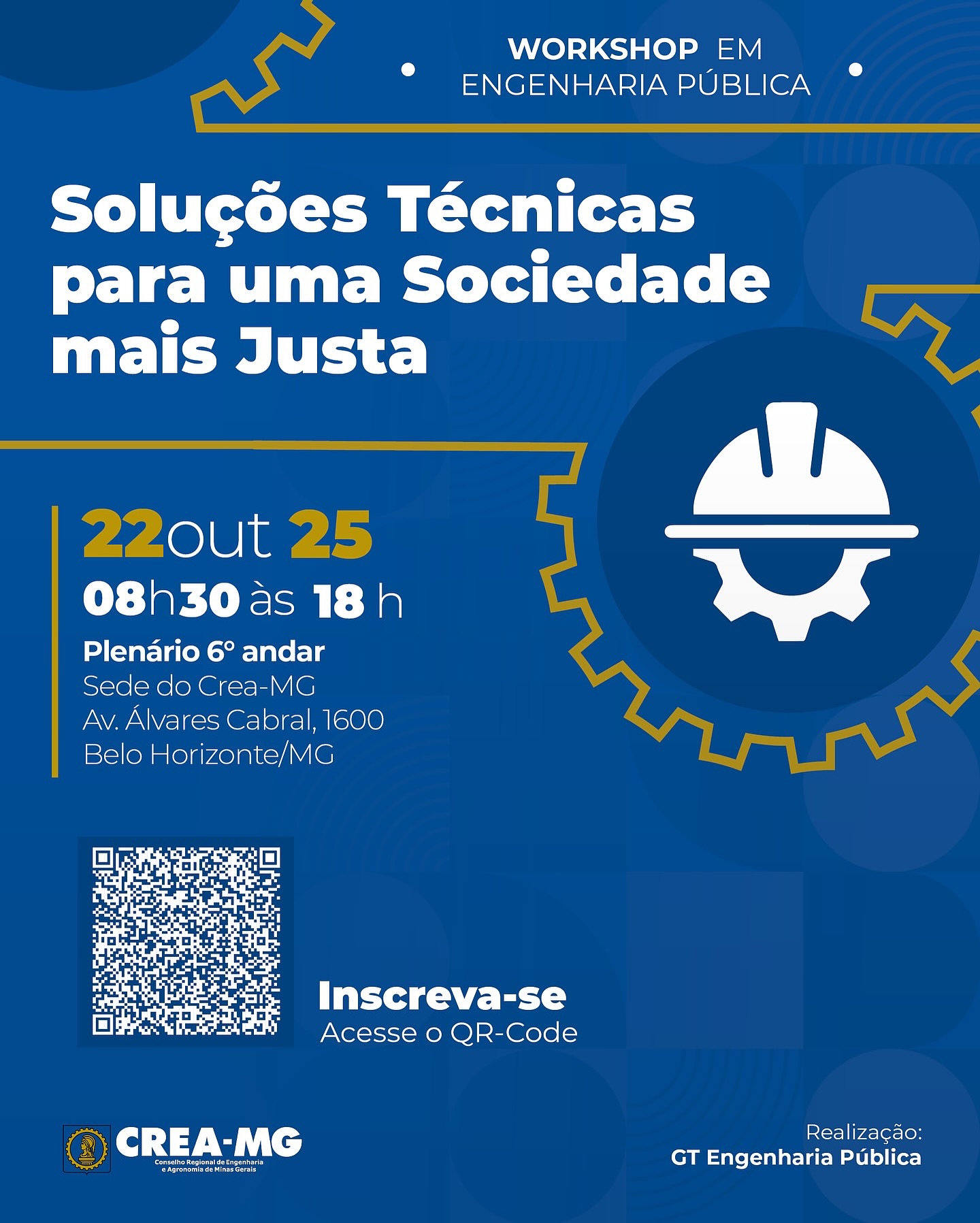 COMEÇA HOJE! PARTICIPE!!  Workshop “Soluções Técnicas para uma Sociedade mais Justa”No dia 22 de outubro, o Crea-MG recebe especialistas de todo o país para discutir como a engenharia pública pode impulsionar políticas públicas e promover qualidade de vida para a população.O evento reunirá cases de sucesso, modelos de implementação e debates sobre os desafios e avanços da engenharia pública no Brasil, reforçando o papel essencial da área na redução das desigualdades sociais. Data: 22/10/2025🕣 Horário: 8h30 às 18h Local: Plenário – 6º andar da sede do Crea-MG Inscrições gratuitas: bit.ly/3Iw04a7