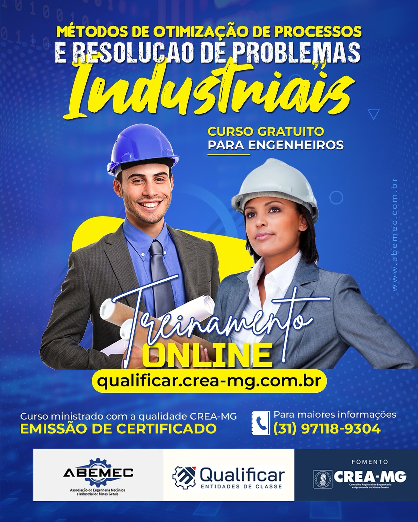 Curso de ‘Métodos de otimização de processos e resolução de problemas industriais’ promovido pela ABEMEC-MG, fomentado pelo CREA-MG dentro do Projeto QUALIFICAR Entidades de Classe, com emissão de certificado. O curso de 12 horas foi ministrado pelo Doutor em Administração e Engenheiro de Produção Thiago Henrique Pereira e está disponível gratuitamente para engenheiros filiados ou com visto junto ao CREA-MG e que esteja em dia com o conselho.Você engenheiro e engenheira acesse o portal do Projeto QUALIFICAR, se inscreva e faça o curso gratuitamente.🏼♂️Você Engenheiro ou Engenheira que não se filiou ao CREA-MG ou que ainda não tem o visto, filie-se e obtenha muitos benefícios em fazer parte do Conselho Regional de Engenharia, Agronomia e Geociências! INSCREVA-SE!🌐 Acesse: qualificar.crea-mg.com.br