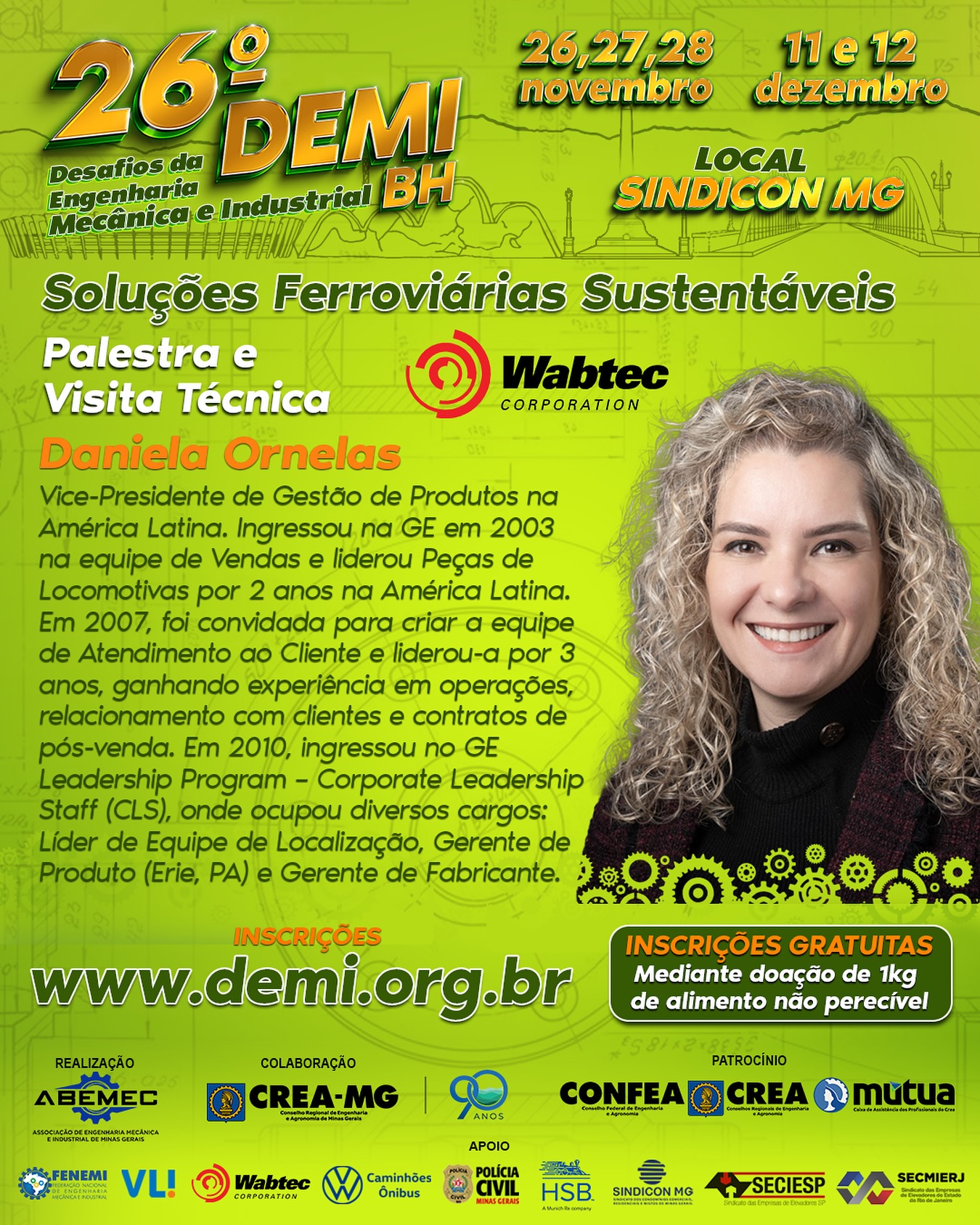 Daniela Ornelas será uma das palestrantes do 26º DEMI Desafios da Engenharia Mecânica e Industrial que acontecerá nos dias 26, 27 e 28 de novembro, e 11 e 12 de dezembro.INSCRIÇÕES GRATUITAS ABERTAS!!O 26º DEMI Desafios da Engenharia Mecânica e Industrial é um evento organizado para colocar você profissional da Engenharia frente a frente com empresas de ponta e profissionais que ocupando cargos estratégicos nessas empresas, poderão compartilhar conhecimentos, experiências e vivências estimuladoras para você que busca evoluir profissionalmente.A atual era de inovação tecnológica em que estamos inseridos destaca a importância de atualizar os conhecimentos técnicos e de relacionamentos, sendo crucial para impulsionar a sua trajetória profissional.As competências fundamentais para o despontamento de um profissional no competitivo mercado corporativo atual incluem fortes habilidade em gestão, liderança e inovação.⚙️ Este evento, voltado para a engenharia e seus profissionais, tem como objetivo apresentar as inovações, tecnologias mais recentes e as metodologias mais eficientes para aumentar os diferenciais estratégicos e a competitividade das organizações. O foco na excelência tecnológica, na gestão estratégica dos colaboradores e do relacionamento com os parceiros e liderança de empresas de engenharia é o alicerce para a criação de ferramentas inovadoras que estabelecem diferenciais competitivos robustos.🏅Nossos palestrantes de renome oferecerão perspectivas sobre como liderar o mercado, gerir processos de forma estratégica e obter resultados quantificáveis e significativos.INSCREVA-SE GRATUITAMENTE:🌐www.demi.org.br