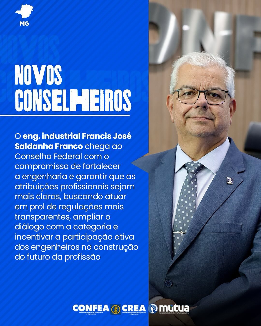 De técnico em fundição a engenheiro, professor e agora conselheiro federal!Francis José Franco tem uma trajetória inspiradora no Sistema Confea/Crea. Com mais de 20 anos na indústria e 36 anos dedicados ao ensino, hoje ele é professor e coordenador do curso de engenharia mecânica em Itaúna (MG), além de iniciar o seu mandato como conselheiro federal.