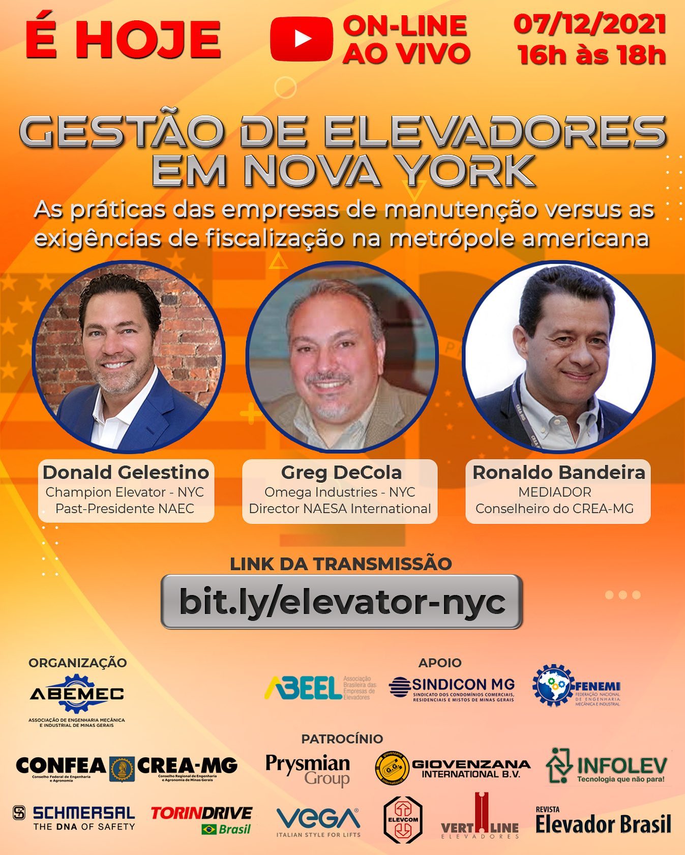 É hoje! Live Internacional de elevadores! No canal da ABEMEC no YouTube a partir das 16h00! ACESSE: bit.ly/elevator-nyc