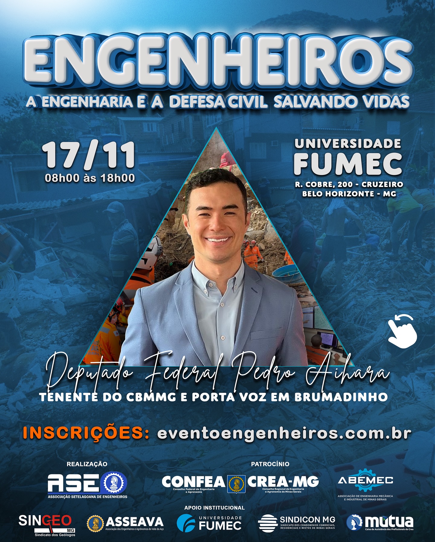 Engenheiros: a Engenharia e a Defesa Civil salvando vidas! ♂️🧱 A Engenharia vai muito além de cálculos e projetos – ela salva vidas! 🌎 Venha descobrir como essa força transformadora se une à Defesa Civil em um evento imperdível para engenheiros, geocientistas e estudantes de engenharia! 🎙️ Palestrante confirmado: Pedro Aihara, Deputado Federal e Tenente Veterano do Corpo de Bombeiros de Minas Gerais, Ex-Porta voz dos Bombeiros em Brumadinho, palestrantes referência nacional em ações integradas entre engenharia e defesa civil, trazendo experiências reais que inspiram e transformam! *E o melhor de tudo: o evento é 100% GRATUITO!* *Data:* 17 de novembro de 2025 (segunda-feira) *Horário:* das 08h00 às 18h00 *Formato:* Evento Presencial no Auditório da Engenharia *Local:* UNIVERSIDADE FUMEC: Rua Cobre, 200, Bairro Cruzeiro (Alto da Av. Afonso Pena), Belo Horizonte/MG 🌐 *INSCRIÇÕES GRATUITAS:* www.eventoengenheiros.com.brGaranta sua vaga e faça parte dessa missão que une conhecimento, prevenção e compromisso com a vida! ️⚙️ Engenharia é mais do que profissão – é vocação para proteger e construir o futuro. Participe e viva essa experiência única!