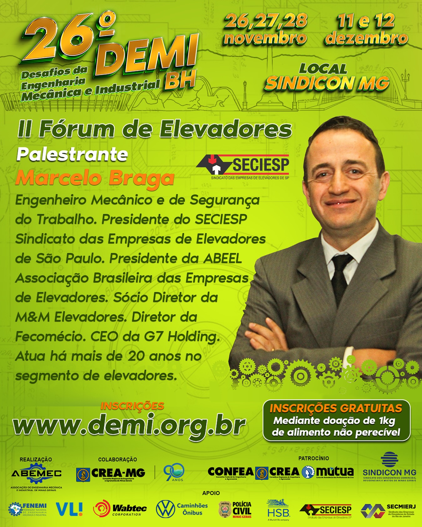 FAÇA SUA INSCRIÇÃO: www.demi.org.br Marcelo Braga é um dos palestrantes convidados no II Fórum de Elevadores de Minas Gerais: Engenheiro Mecânico e de Segurança do Trabalho. Presidente do SECIESP Sindicato das Empresas de Elevadores de São Paulo. Presidente da ABEEL Associação Brasileira das Empresas de Elevadores. Sócio Diretor da M&M Elevadores. Diretor da Fecomécio. CEO da G7 Holding. Atua há mais de 20 anos no segmento de elevadores. ⚙️ A ABEMEC-MG (Associação Brasileira de Engenheiros Mecânicos e Industriais de MG) tem o prazer de convidá-lo(a), para II Fórum de Elevadores onde apresentaremos sugestões para serem discutidas baseadas em experiência de cidades nacionais e internacionais em função da quantidade excessiva de acidentes que ultimamente vem ocorrendo. Contaremos com a presença de Fernando Tupinambá e Marcelo Braga, que contribuirão significativamente para o enriquecimento das discussões. O fórum abordará temas de vital importância para o setor, entre os quais se destacam:- Análise estatística de acidentes;- Relatórios a serem apresentados e Periodicidade;- Processos de homologação de empresas e produtos;- Procedimentos para a emissão e envio de Relatórios de Ocorrências;- Modernização de equipamentos;- Implementação de testes periódicos e adesivagem;- Proposta de Legislação.️Detalhes da Reunião:🗓️ Data: 28/11/2024 Horário: 14h às 16hLocal: SINDICON -MGConfirmação de Presença:🌐 Devido à limitação de espaço no local, solicitamos a gentileza de se inscrever através do formulário no link demi.org.br o mais breve possível.🤝 Agradecemos antecipadamente por sua colaboração e esperamos contar com sua valiosa presença.