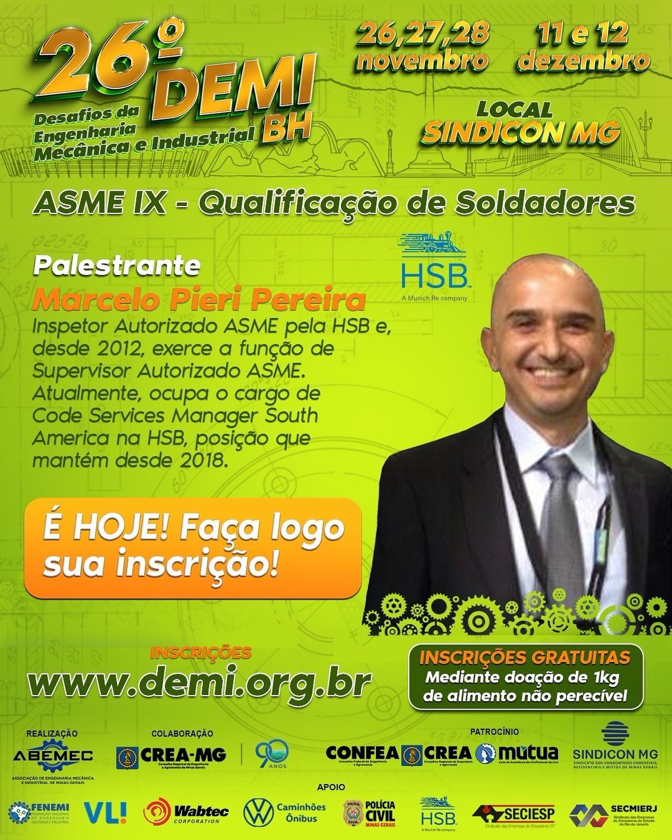 Hoje tem mais!! Treinamento ASME presencial!! Faça sua inscrição pelo link:  demi.org.br