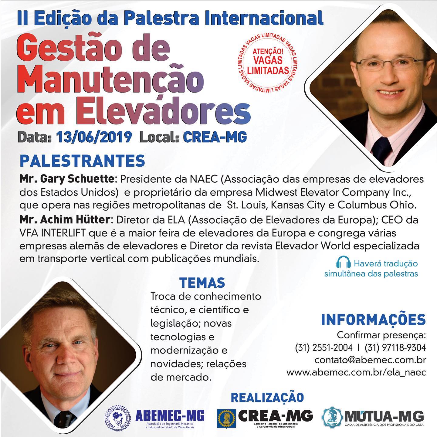 Não perca a oportunidade de expandir os seus conhecimentos no mercado de elevadores. Participe da II Edição da Palestra Internacional “Gestão de Manutenção em Elevadores” que acontecerá no Crea-MG. Para maiores informações ligue: (31) 2551-2004