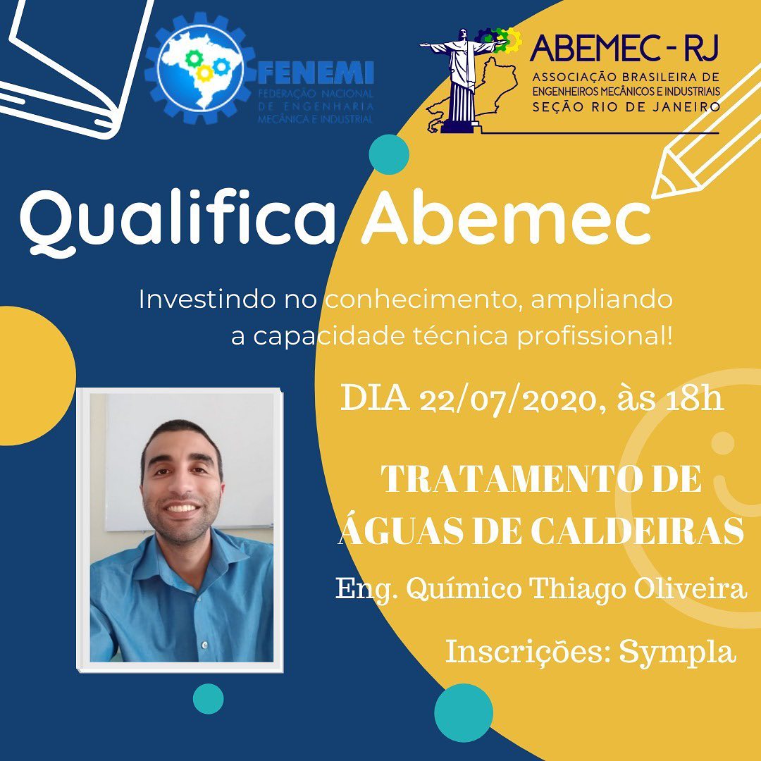 Olá Pessoal, vem aí o Qualifica ABEMEC – investindo no conhecimento, ampliando a capacidade técnica profissional.Abordaremos o tema: Tratamento de Águas de Caldeiras com Eng. Químico Thiago OliveiraDia 22/07/2020 (quarta-feira) às 18 horas do Rio de Janeiro – RJ, online e gratuito.Inscrição: Link na Bio