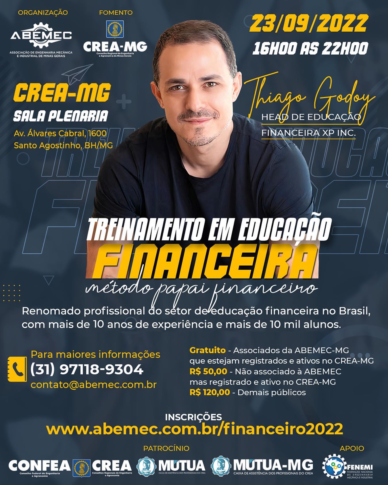 - Próximo Treinamento presencial em Educação Financeira com o Head da XP Investimentos Thiago Godoy. Não perca a oportunidade de melhorar seu relacionamento com o seu dinheiro! Aprender a administrar finanças e investimentos. FAÇA LOGO A SUA INSCRIÇÃO! www.abemec.com.br/financeiro2022