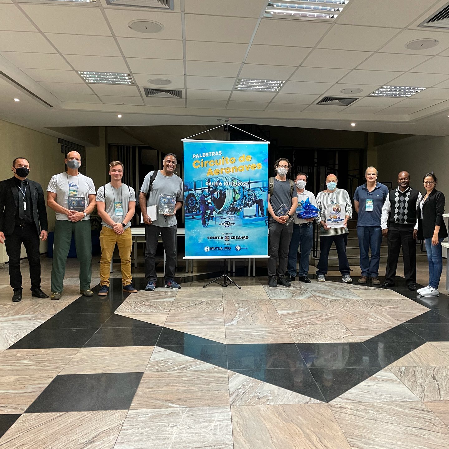 Turma da aula final do Segundo Módulo do Circuito de Manutenção de Aeronaves sobre Inspeção. Houve sorteio de brindes para os alunos presenciais. Outros 61 alunos inscritos acompanhando virtualmente já que o evento é híbrido: presencial e on-line.