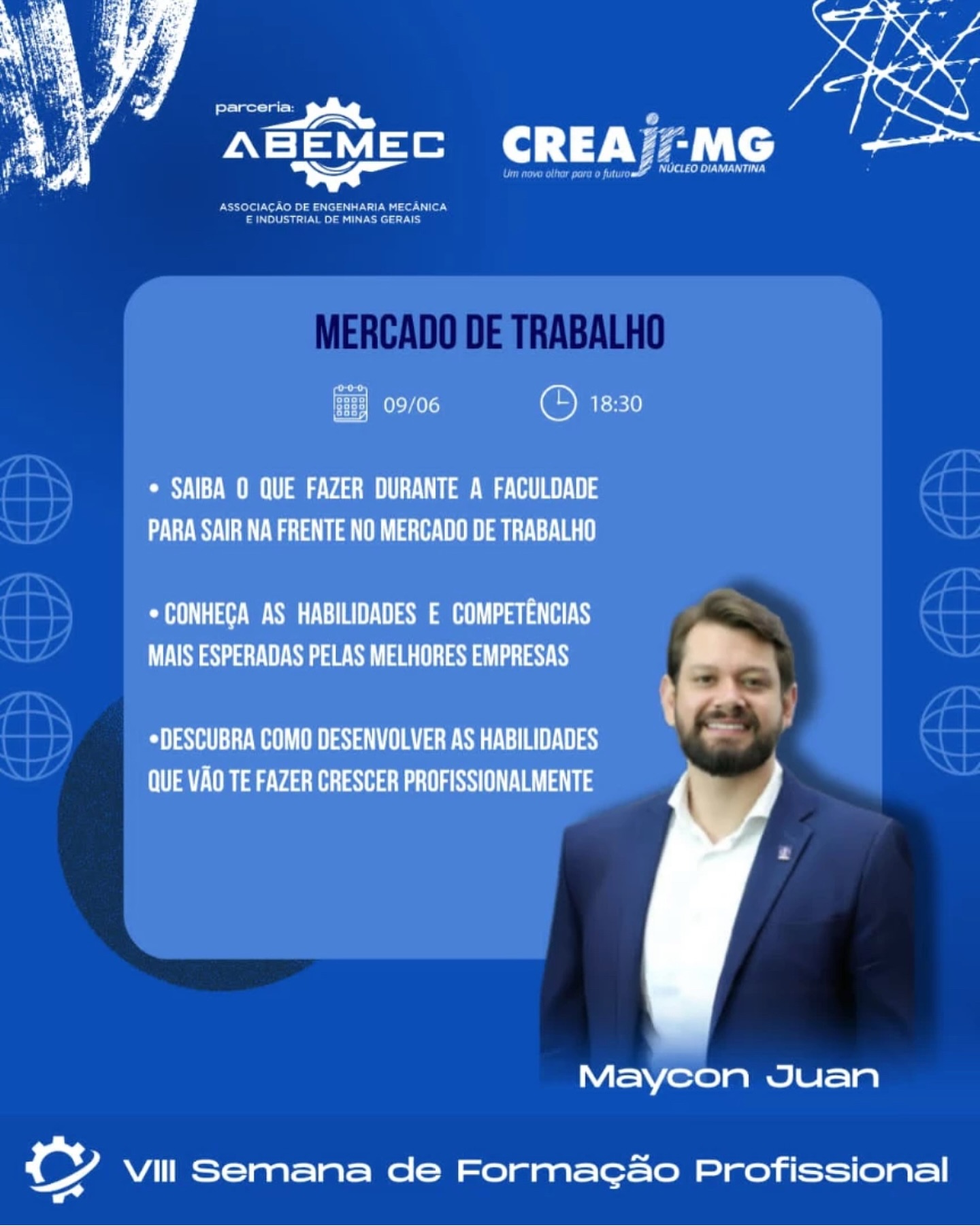 VEM AÍ A PRIMEIRA PALESTRA DA NOSSA VIII SEMANA DE FORMAÇÃO PROFISSIONAL! E pra abrir com chave de ouro, temos um convidado mais que especial: Maycon Juan! PALESTRANTE CONFIRMADO: MAYCON JUAN!⚙️ Ex-aluno de BC&T na UFVJM, hoje Conselheiro Federal pelo CONFEA e Chefe de Gabinete na Câmara dos Deputados, Maycon Juan é um exemplo real de onde a Engenharia pode te levar quando se une propósito, visão e coragem!🏼‍♂️O Maycon Ruan é Engenheiro de Produção e de Segurança do Trabalho; MBA em Gestão de Projetos; Especialista em Defesa Civil, Políticas Publicas e Gestão Governamental; Fundador do projeto Engenheiros Fora da Curva, que chega à 4ª edição em 2025!🌐 Com uma trajetória inspiradora e muito conteúdo na bagagem, Maycon vem para mostrar que ser engenheiro é mais do que formação, é transformação. Prepare-se para uma palestra que vai mexer com a sua forma de enxergar a profissão e seu futuro!#abemecmg #creamgjrdiamantina #confea #mutuamg #mutua #MayconJuan #UFVJM #CreajrMG#EngenhariaComPropósito#EngenheirosForaDaCurva#InspiraçãoQueTransforma #Diamantina #BCeT#VIIIsemanadeformação
