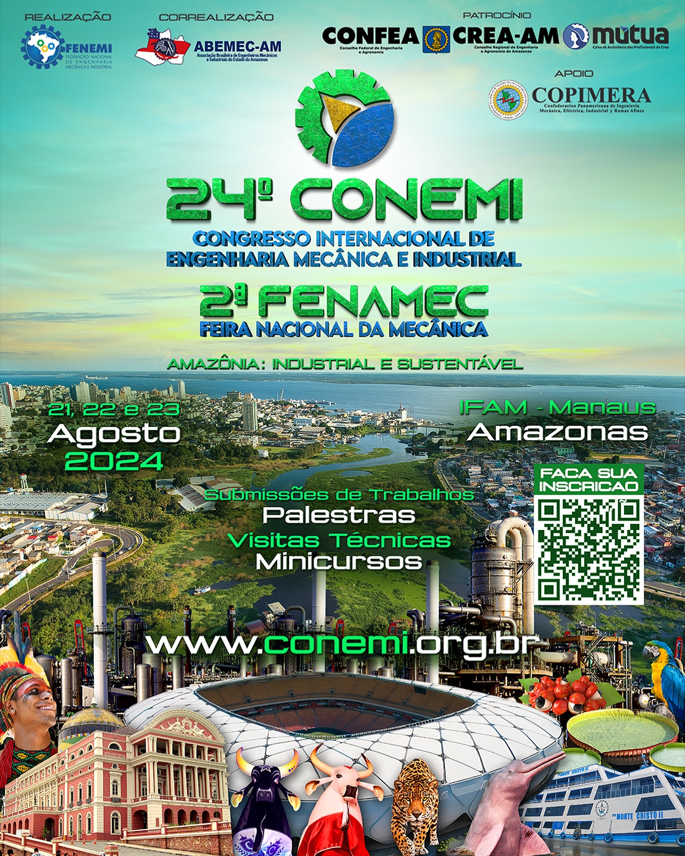 Vem aí o 24° CONEMI Congresso Internacional de Engenharia Mecânica e Industrial, que este ano acontecerá no IFAM Instituto Federal do Amazonas em Manaus/AM, onde teremos submissões e defesas de artigos acadêmicos, palestras, minicursos, visitas técnicas e a 2ª FENAMEC Feira Nacional da Mecânica. O evento é organizado pela FENEMI Federação Nacional de Engenharia Mecânica e Industrial e coorganizado pela ABEMEC-AM Associação Brasileira de Engenheiros Mecânicos e Industriais do Amazonas; conta com o patrocínio do Sistema CONFEA/CREA-AM/MÚTUA e o apoio da COPIMERA Confederacíon Panamerica de Ingeniería Mecánica, Elétrica, Industrial e Ramas Afines. As inscrições e submissões de trabalhos já estão abertas!🌐 Acesse: www.conemi.org.br. #conemi #fenamec #confea #creaam #mutua #mutuaam #fenemi #abemecam #engenhariamecanica #congresso#feiraindustrial #manaus #amazonas