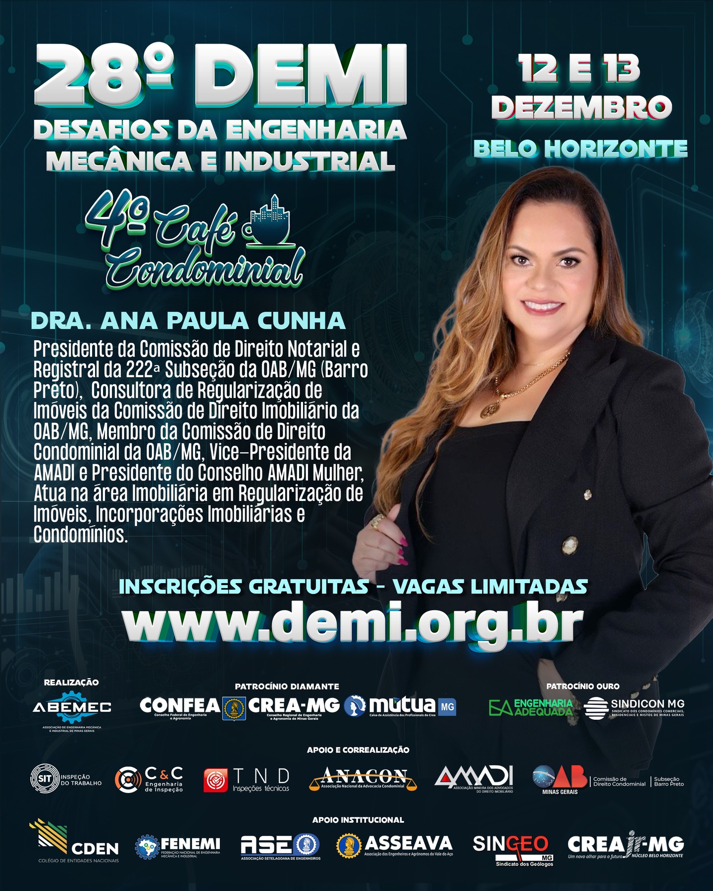 Vem aí o 28º DEMI – Desafios da Engenharia Mecânica e Industrial e o CAFÉ CONDOMINIAL ACONTECE DENTRO DO EVENTO!⚙️O encontro definitivo para quem respira inovação, tecnologia e o futuro da engenharia!PALESTRANTE: Presidente da Comissão de Direito Notarial e Registral da 222ª Subseção da OAB/MG (Barro Preto), Consultora de Regularização de Imóveis da Comissão de Direito Imobiliário da OAB/MG, Membro da Comissão de Direito Condominial da OAB/MG, Vice-Presidente da AMADI e Presidente do Conselho AMADI Mulher, Atua na área Imobiliária em Regularização de Imóveis, Incorporações Imobiliárias e Condomínios.⚙️Realizado pela ABEMEC-MG, com o patrocínio do CONFEA, CREA-MG e MÚTUA-MG, o DEMI chega à sua 28ª edição nos dias 12 e 13 de dezembro reunindo profissionais, estudantes e especialistas para dois dias intensos de conhecimento, networking e inspiração. O que você vai encontrar no 28º DEMI?Palestras técnicas de alto impacto com temas atuais da Engenharia Mecânica e Industrial 🧠⚙️Debates sobre inovação, automação e avanços tecnológicos que estão moldando o futuro da profissão 🤖Insights exclusivos com profissionais renomados do setor Um ambiente dinâmico para ampliar sua rede de contatos e oportunidades 🤝 Por que participar?Porque o DEMI é o espaço onde ideias ganham força, projetos encontram caminhos e carreiras se transformam. Um evento feito por engenheiros, para engenheiros — e para todos que querem estar na linha de frente da evolução tecnológica. 🌍 Marque na agenda: 12 e 13 de dezembro Prepare-se para viver uma experiência única na engenharia!🌐 Inscrições poderão ser feitas no: www.demi.org.brNão fique de fora! Sua próxima grande inspiração pode nascer aqui. ⚙️