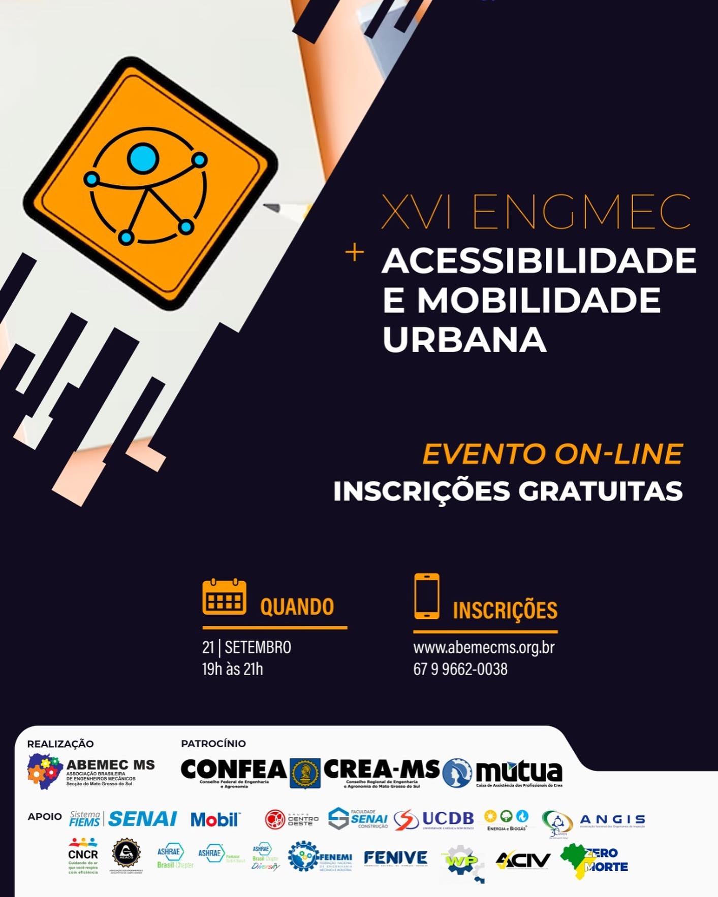 *XVI ENGMEC MS – 16º Encontro Regional dos Engenheiros Mecânicos e Industriais de Mato Grosso do Sul**Acessibilidade e Mobilidade Urbana: Como a Engenharia Pode Promover uma Mudança de Comportamento*Data: 21 de setembro de 2023A partir das 19h (horário do MS)A mobilidade urbana é um desafio enfrentado por muitas cidades ao redor do mundo. As grandes metrópoles estão cada vez mais congestionadas, levando a um aumento no tempo de viagem e ao estresse diário dos seus habitantes. Mas além disso, existe um outro aspecto importante que muitas vezes é negligenciado: a acessibilidade.Transmissão ao vivo no nosso canal do YT.https://www.youtube.com/watch?v=YqzC1Dmu9d8Inscrições gratuitas:https://www.even3.com.br/xvi-engmec-acessibilidade-e-mobilidade-urbana-388881/ Associação Brasileira de Engenheiros Mecânicos, secção Mato Grosso do Sul.